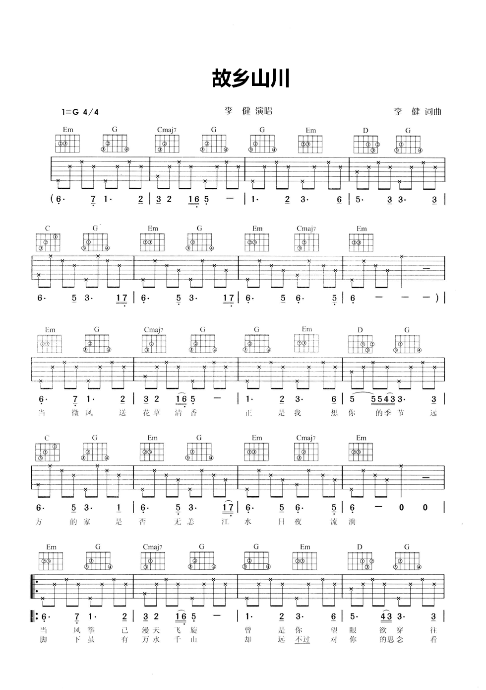 故乡山川吉他谱 - 李健 - G调吉他弹唱谱
