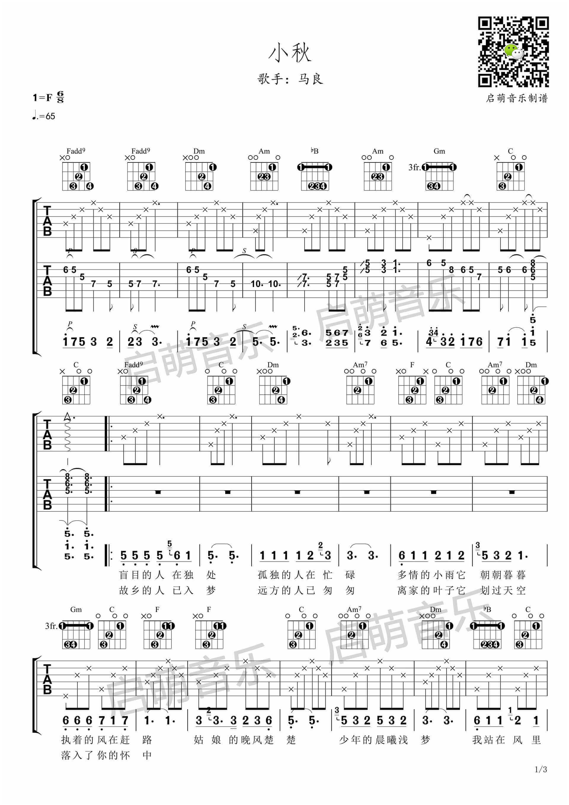 曲谱介绍: 《小秋》吉他谱由启萌编配,采用F调指法,每当我听到这首歌就会回想起,铺满阳光的小道,嗅着早在身畔的阳光,是那醉人的香意,那是花儿在我们的鼻尖悄悄开放。这时我的心情是明朗的,这歌承载了太多太多,我听到了孤独,听到了回忆,还是民谣的歌曲耐听,有味道。重要提示:我们的歌吉他谱更新啦,学完这首后,顺便把下首学了吧。