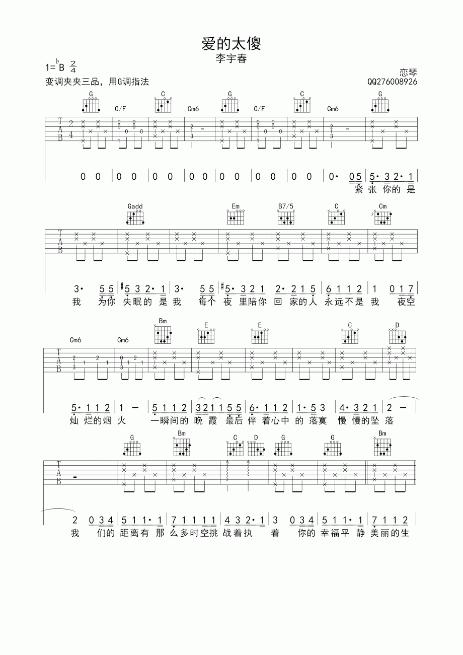 曲谱介绍: 李宇春《爱的太傻》吉他弹唱谱,采用G调指法编配,共有2张高清图谱,免翻页排版设计。