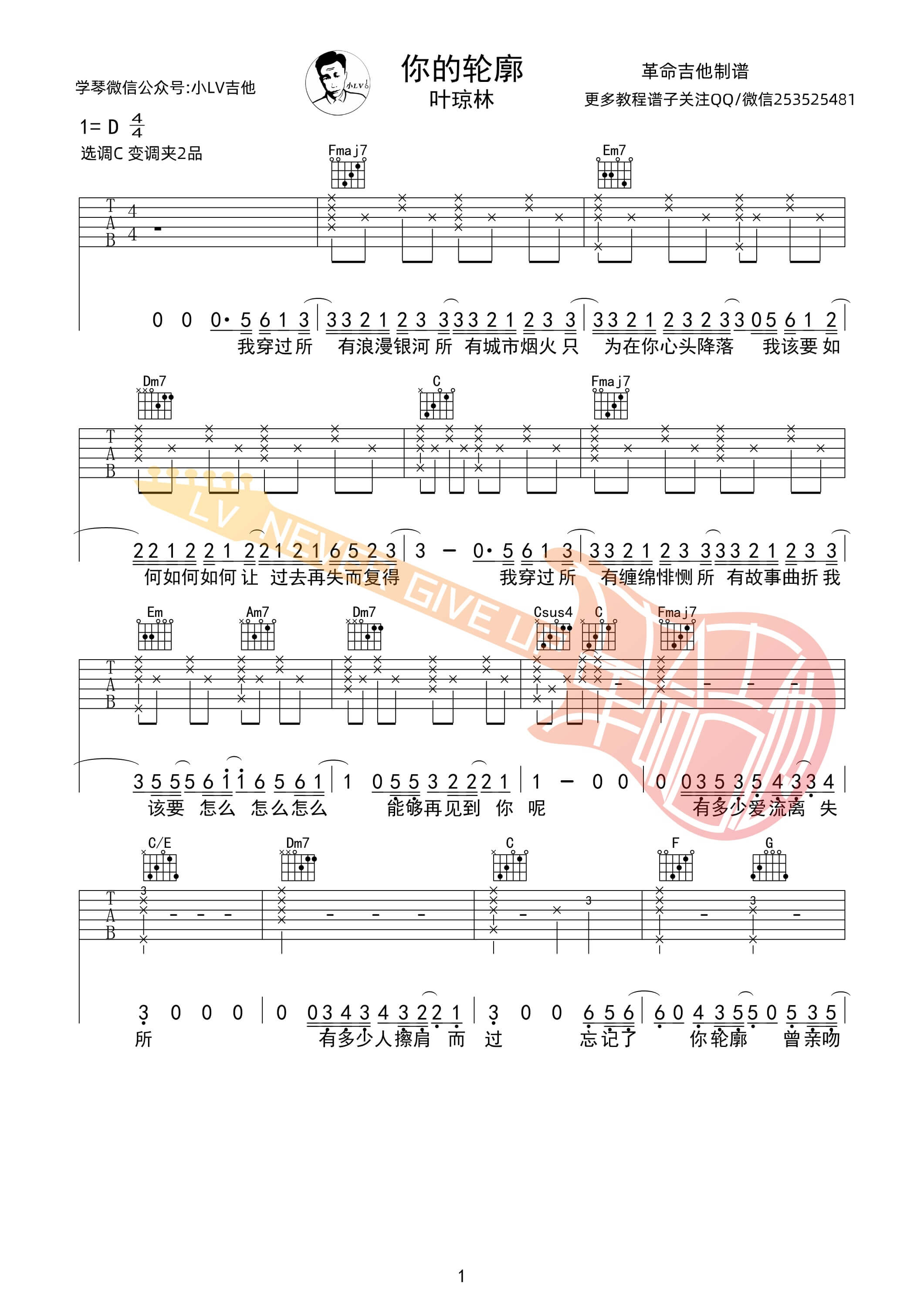 你的轮廓吉他谱 - 叶琼林 - D调吉他弹唱谱