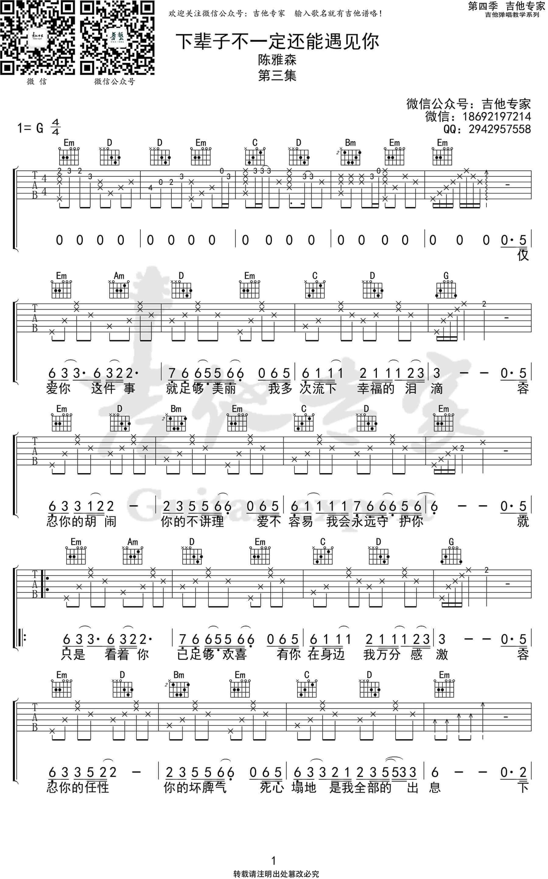 曲谱介绍: 《下辈子不一定还能遇见你》吉他谱,G调编配弹唱谱,两张吉他谱图片。由李守俊作词,张博文作曲,陈雅森演唱的歌曲,发行于2020年1月14日。这首歌曲所属于同名专辑《下辈子不一定还能遇见你》中。《下辈子不一定还能遇见你》这首歌演唱歌手—陈雅森,出生于黑龙江省哈尔滨市,中国大陆男歌手、流行音乐唱作人、演员,2009年毕业于中央音乐学院。一生能遇见一个彼此相爱的人,是多少人没有的运气。TIPS:在这里向大家推介另外一首,它就是桃花诺吉他谱啦,非常动听的一首曲子!
