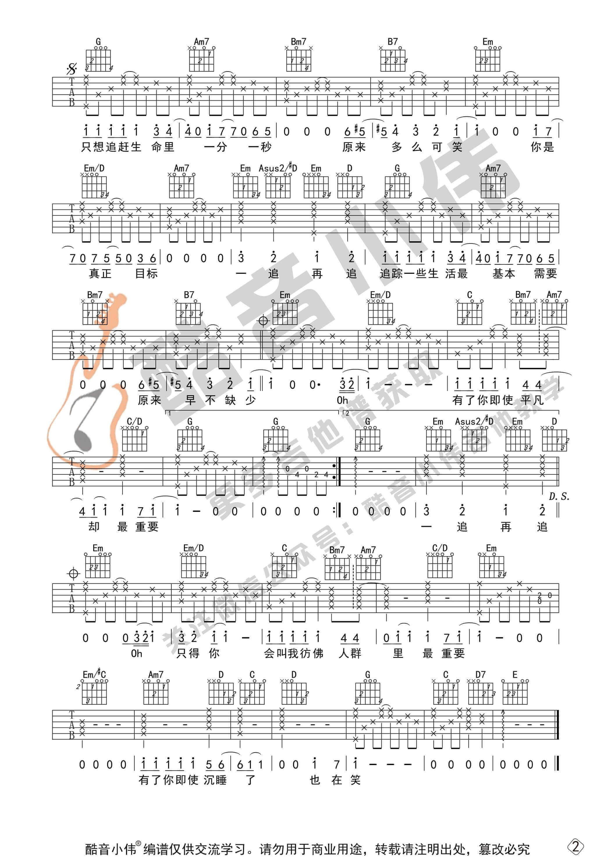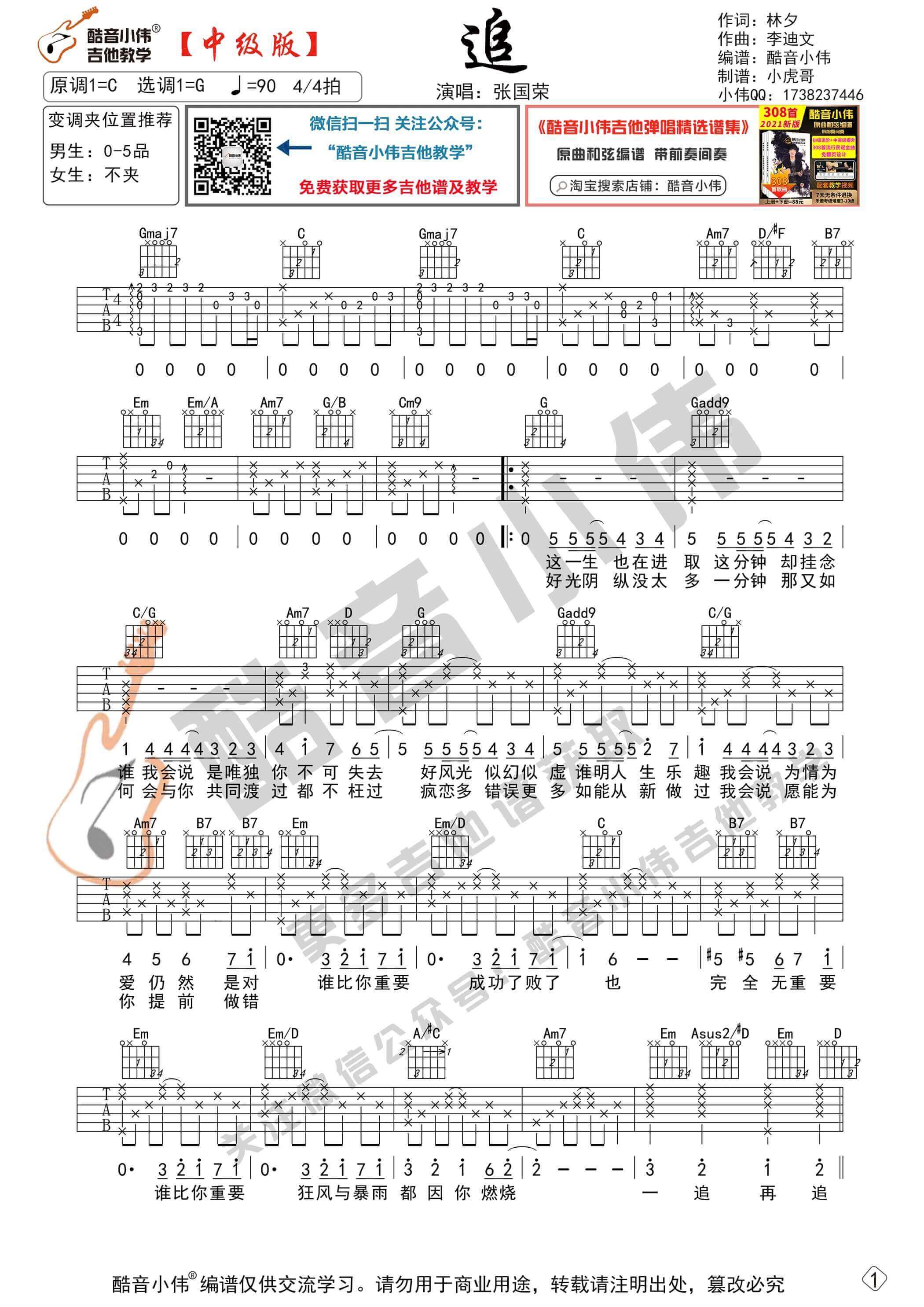 曲谱介绍: 曲谱适合有一定基础的琴友弹奏,选用G调指法编谱,变调夹的位子可以根据我的推荐来选择。使用了分解的节奏型,注意右手弹奏和弦的变化,练习帮助提升水平,先弹奏会曲谱,再清唱会,然后弹唱结合一起练习。《追》是由张国荣演唱的歌曲,是1994年陈可辛执导的电影《金枝玉叶》的插曲。在这首歌曲中张国荣唱穿越了生活,变成永恒游走在时空里的声音。声音和感情饱满且收放自如,“追”时放,“笑”时收。好光阴并不会太多,一分钟都珍贵。听兄弟说,成都吉他谱听了耳朵会怀孕,快快学起来,学完去撩妹! 吉他弹唱演示及视频教学
