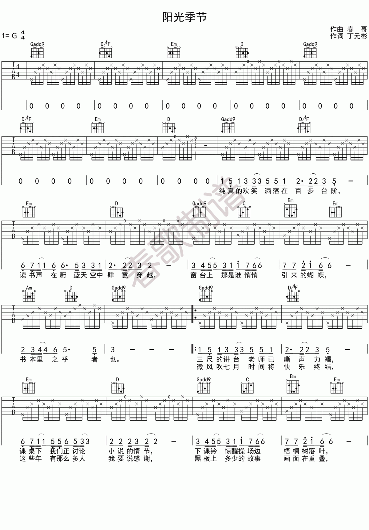 曲谱介绍: 《阳光季节》吉他弹唱谱,采用G调指法编配,共有2张高清图谱,免翻页排版设计。