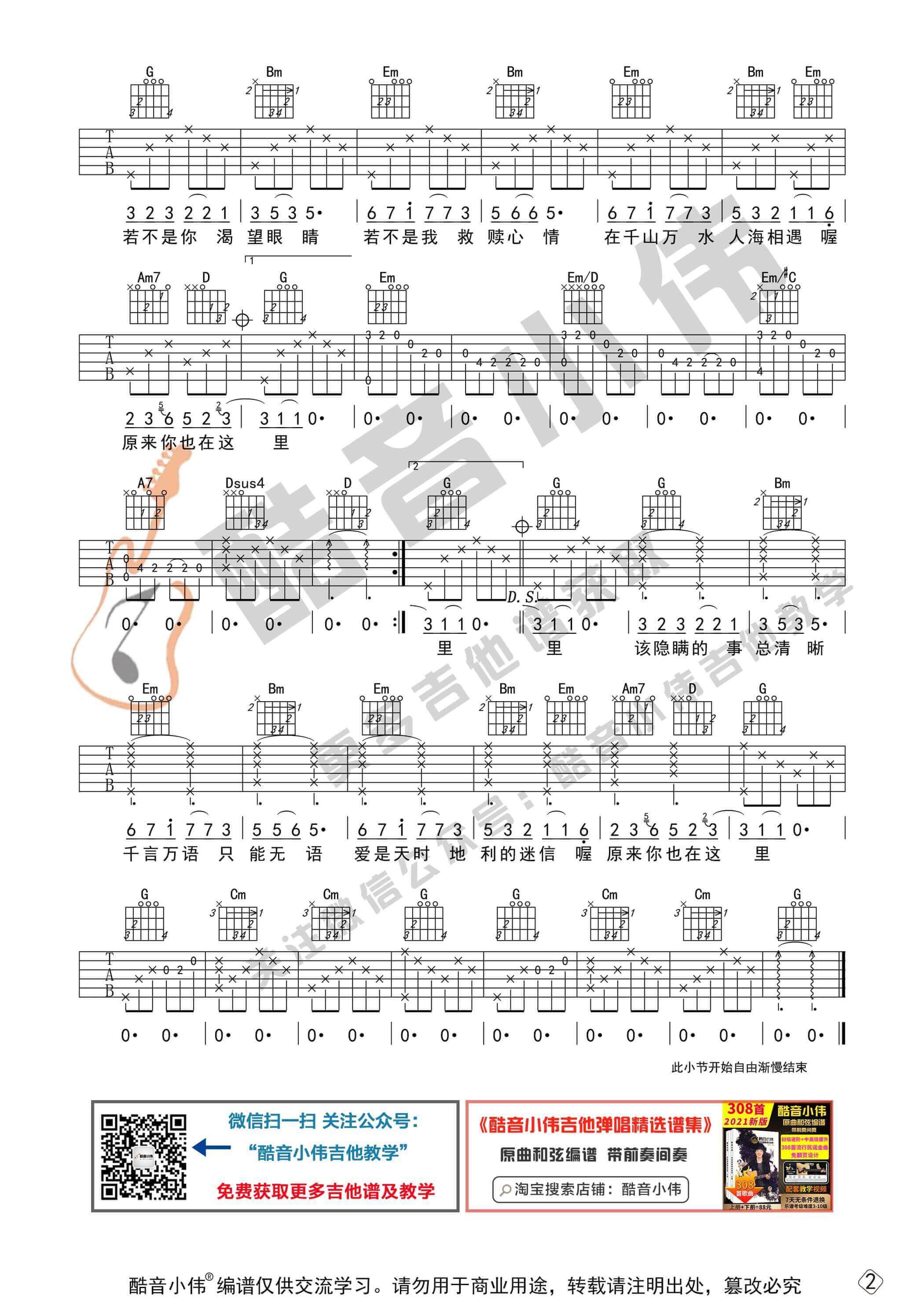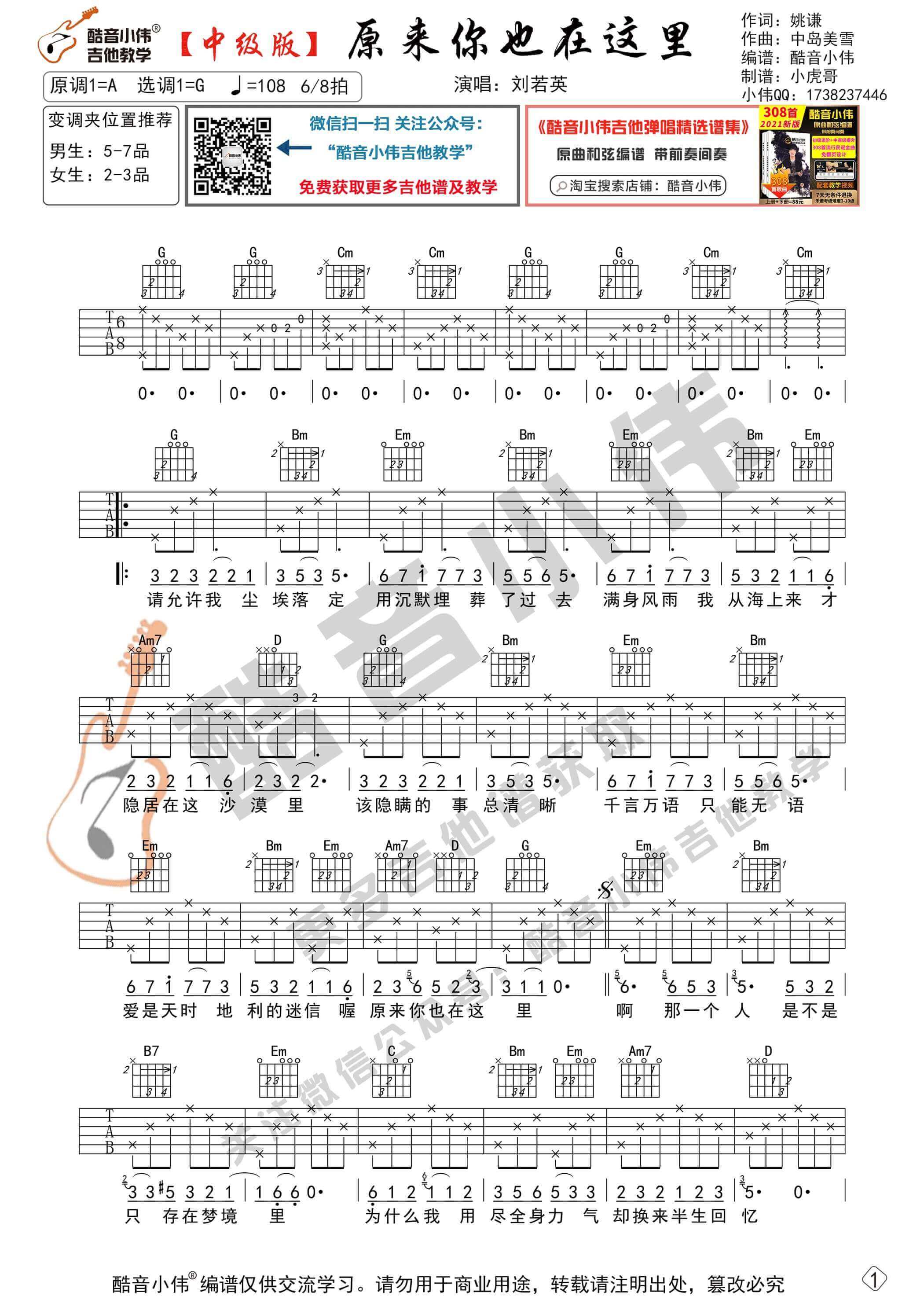 曲谱介绍: 曲谱适合有一定基础的琴友弹奏,选用G调指法编谱,变调夹的位子可以根据我的推荐来选择。先弹奏会曲谱,再清唱会,然后弹唱结合一起练习。《原来你也在这里》是由刘若英演唱的歌曲,以张爱玲的小说《爱》为灵感的歌曲,小说《爱》中说出的是一种错过的情愫,歌曲表达的是一种充满希望的遇见。刘若英的歌声同样真挚而干净,因为是有感而发、用情感来歌唱,所以能轻易感染听众。听说,有魅力的帅哥美的都在悄悄练这首不知所措吉他谱,小伙伴们也快练起来吧~ 吉他弹唱演示及视频教学