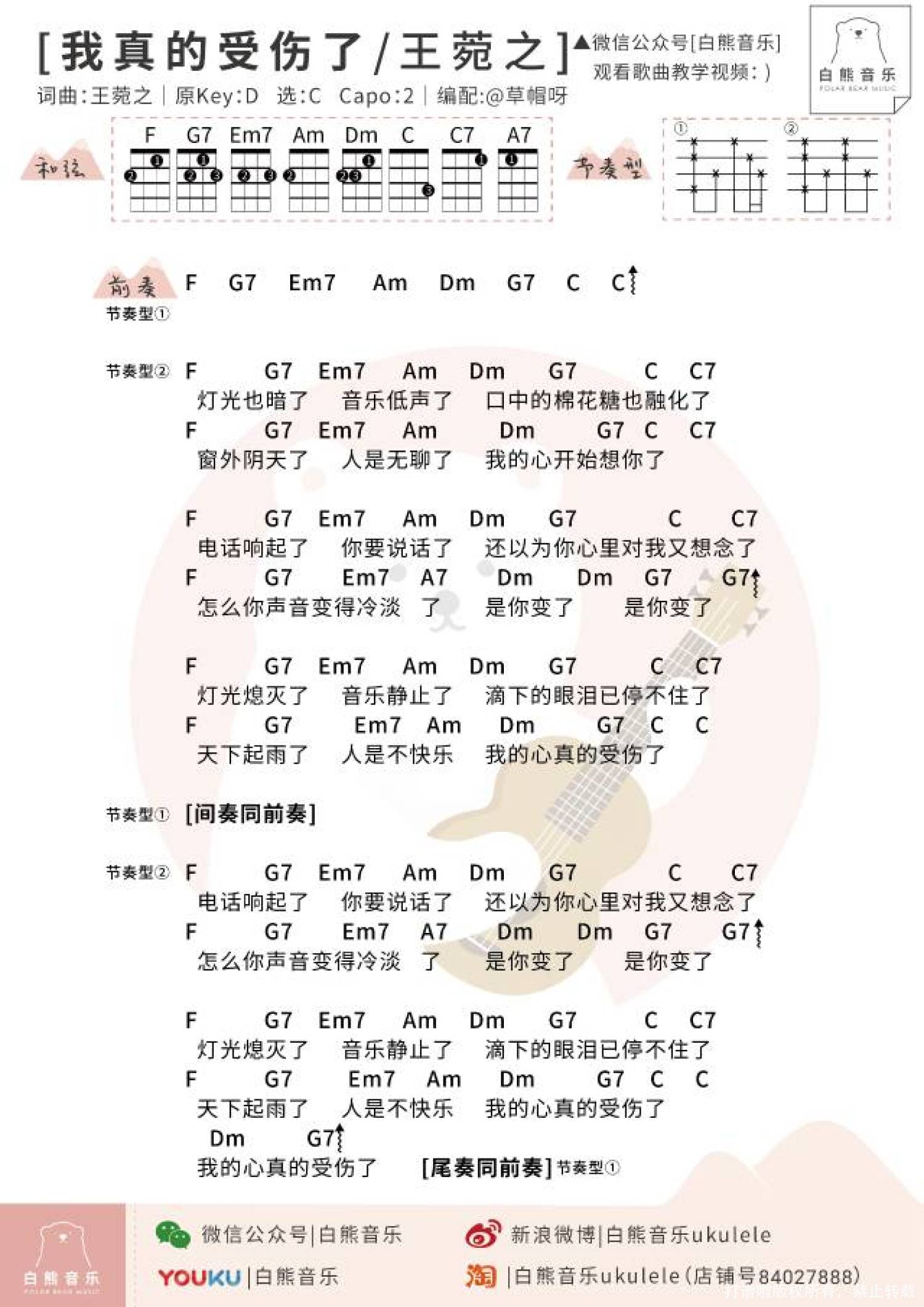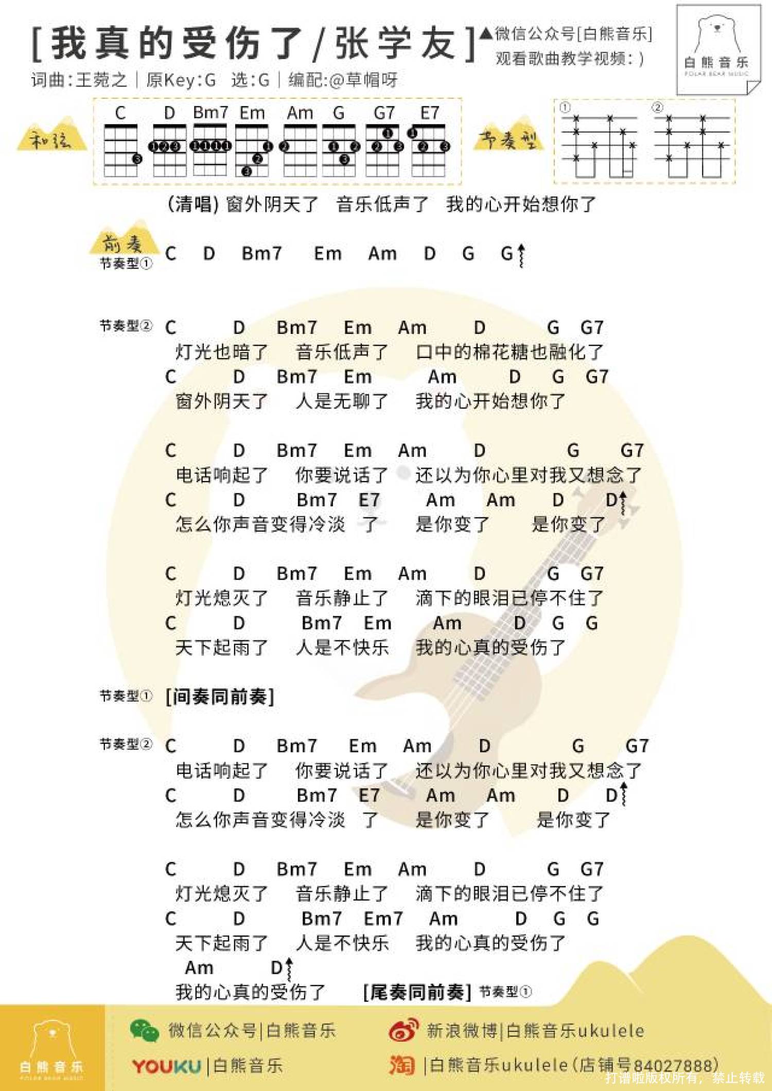 曲谱介绍: {窗外阴天了人是无聊了我的心开始想你了}◎〈我真的受伤了〉是张学友演唱的一首经典歌曲,由王菀之作词、作曲,收录在张学友2001年9月26日发行的专辑『学友.热』。◎〈我真的受伤了〉这首歌放在专辑里的第三首,可能学友和欧丁玉也觉得这首安安静静的小调的确是上品,对它抱有期望。的确,这首歌影响很大,深受年轻人的喜爱,翻唱者不胜枚举,KTV点唱率永远的前五名。◎淡淡忧伤牵动人心,一首小诗就是歌词,还整齐到从头到尾都是“了”字尾,只有倒数第二句字不同音同。※2010年台湾歌手田馥甄在个人演唱会:Love!ToHebe音乐会上翻唱了《我真的受伤了》,并收录在2010年12月3日发行的专辑《Love!ToHebe影音馆》※2005年王菀之翻唱了自己为张学友创作的《我真的受伤了》,并收录在2005年5月19日发行EP《Ivana》学友不去用被人称道的张力十足厚浑洪亮的那种方式,而是如此温柔细腻,还是那么出众。Ukulele弹唱教学教学|@草帽呀草帽同款琴|KakaMad全单好琴尤克里里弹唱谱▼弹奏难度 (较易)女声版男生版