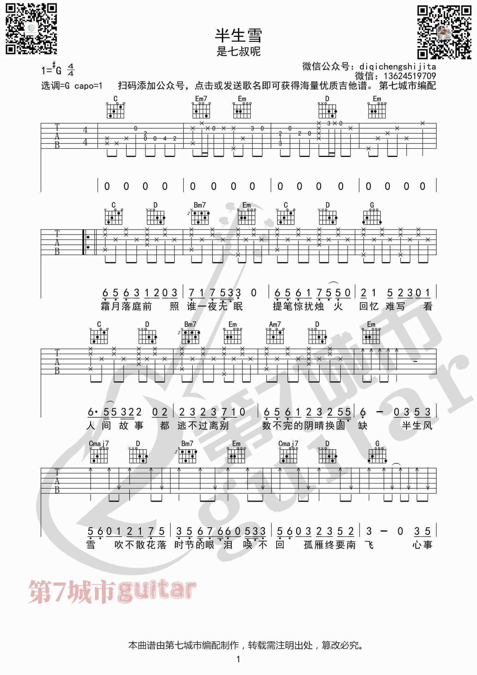 半生雪吉他谱 - 是七叔呢 - G调吉他弹唱谱