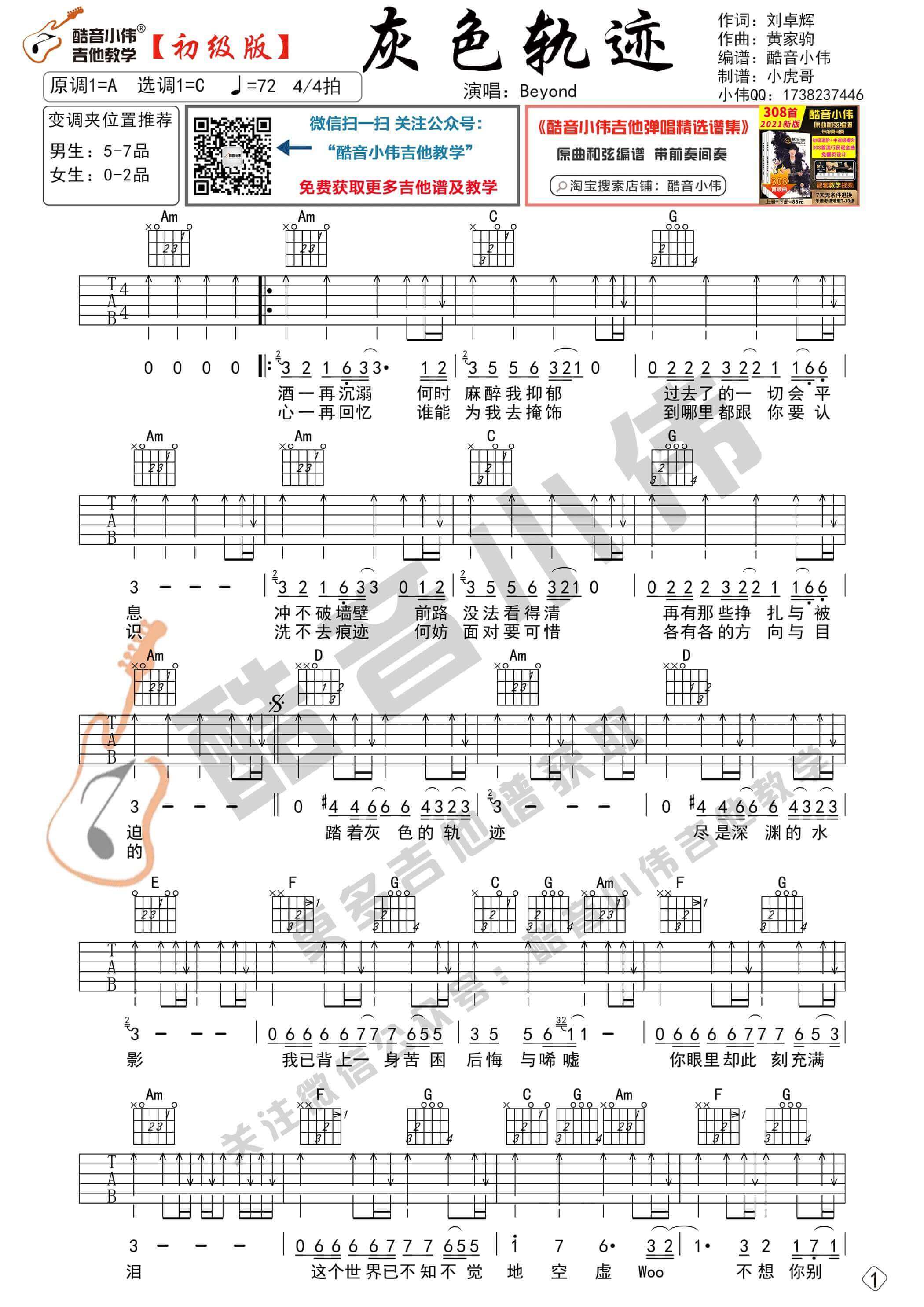 曲谱介绍: 曲谱适合初学者练习,选用C调指法,变调夹的位子可以根据我的推荐来选择。使用扫弦节奏型,先弹奏会曲谱,再清唱会,然后弹唱结合一起练习。《灰色轨迹》是中国香港摇滚乐队Beyond的一首歌曲,这首歌曲所营造的意境和黄家驹悲怆沙哑的嗓音,让人有极强的代入感。里面歌词的内容看似迷茫无助,但歌曲所表达的信念却是坚定的,副歌最后一句:“不想你别去”点明了态度。这首不得不爱吉他谱也很帅,快点去学习吧,没学会的小伙伴要继续加油喔,稳!