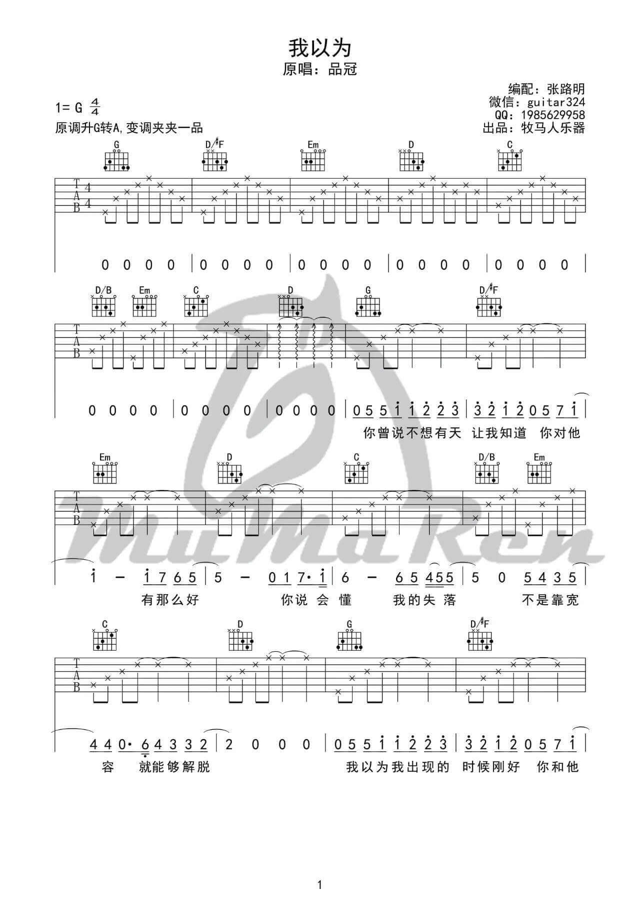 我以为吉他谱 - 品冠 - G调吉他弹唱谱