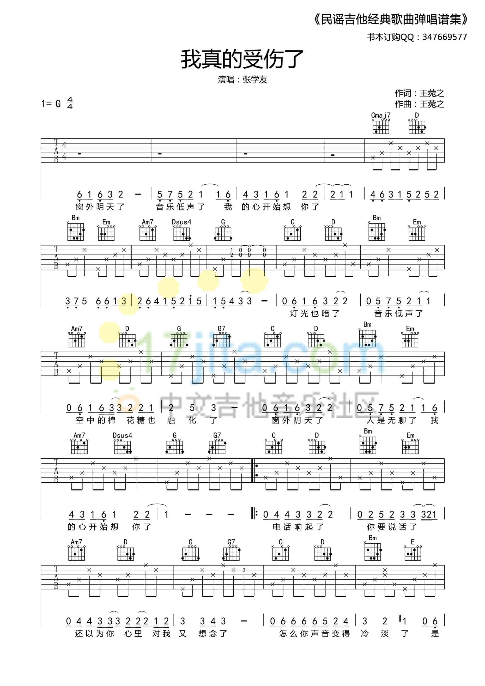 曲谱介绍: 我真的受伤了吉他谱采用了G调指法,由17吉他教室编配完成。开头是清唱的,张学友以这种方式演唱作品,非常吸引听众的耳朵呀,而且张学友虽然是中国香港的歌手但是普通话的发音非常标准,整首歌曲都非常棒,旋律非常的优美,让人忍不住单曲循环呀,加上张学友的唱腔,绝了,让人非常想安静的听这首歌,这首歌呢是伤感类型的情歌,但是却不是那种声嘶力竭的拼命用高音,反倒是缓缓的歌唱,更显动听。听兄弟说,执迷不悟吉他谱听了耳朵会怀孕,快快学起来,学完去撩妹!
