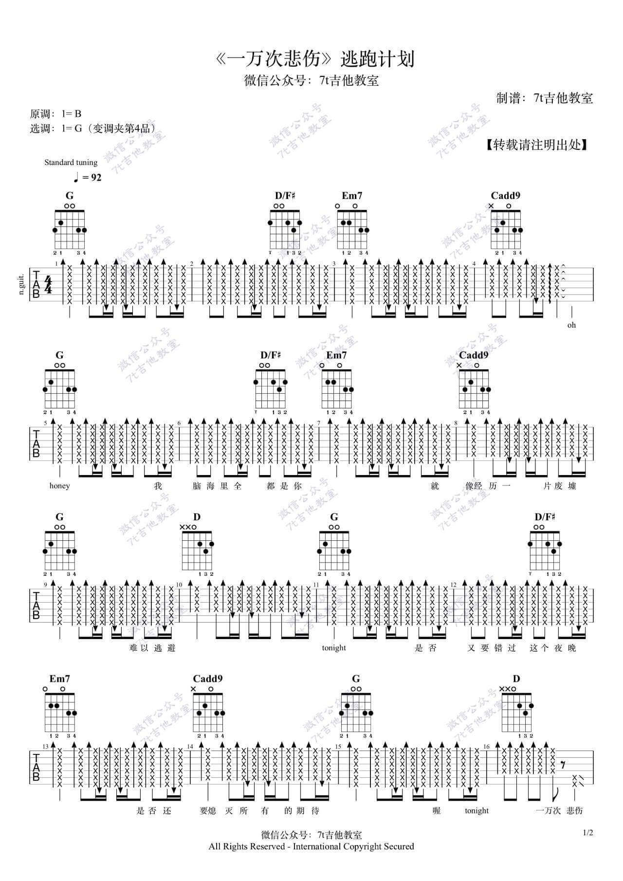 曲谱介绍: 一万次悲伤吉他谱由7t吉他教室编配完成,采用了G调指法,除了这首谱以外,Stay Here吉他谱也非常不错,速度去围观一下吧! 吉他弹唱演示及视频教学