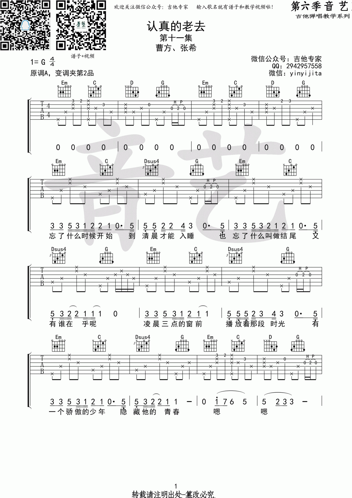 认真的老去原版吉他谱 - G调吉他弹唱谱 - 原版