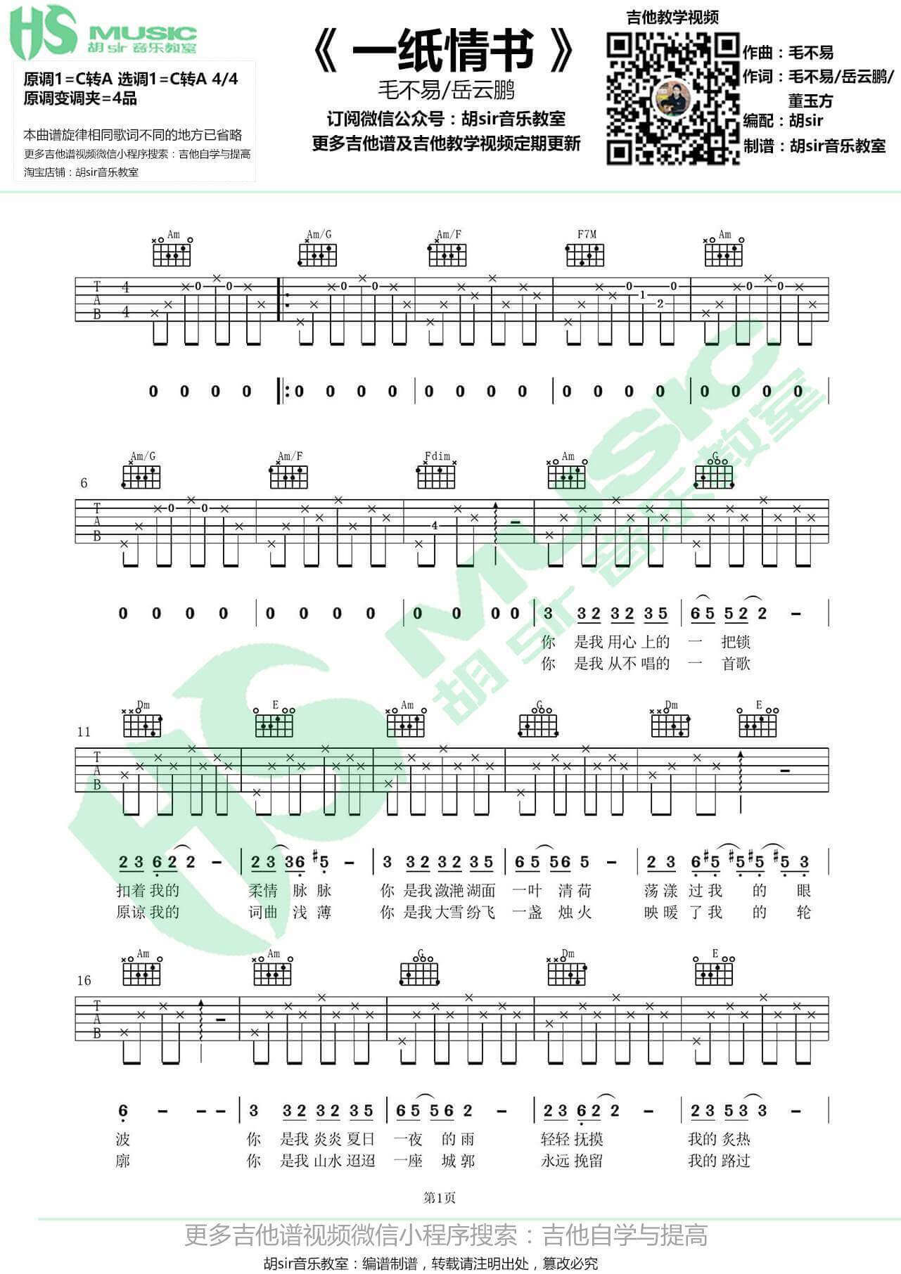 曲谱介绍: 一纸情书吉他谱由胡sir音乐教室提供,采用了C转A调指法编配完成。一纸情书是毛不易不算特别火的一首歌,却还是非常非常好听,以前看综艺的时候就觉得毛不易这个人很踏实,是一个非常敬职敬业的歌手,虽然大家都说他的风格很像薛之谦,但是我总不这么认为,薛之谦或许非常火,但总感觉揭不开他的面纱,毛不易却是能把他非常优秀的方面都彰显出来,从一纸情书这首歌就能看出来毛不易是一个创作高手。号外:在这里小编要推荐这首成全吉他谱,它也很好听,大家赶快学习起来啦,不要犹豫!