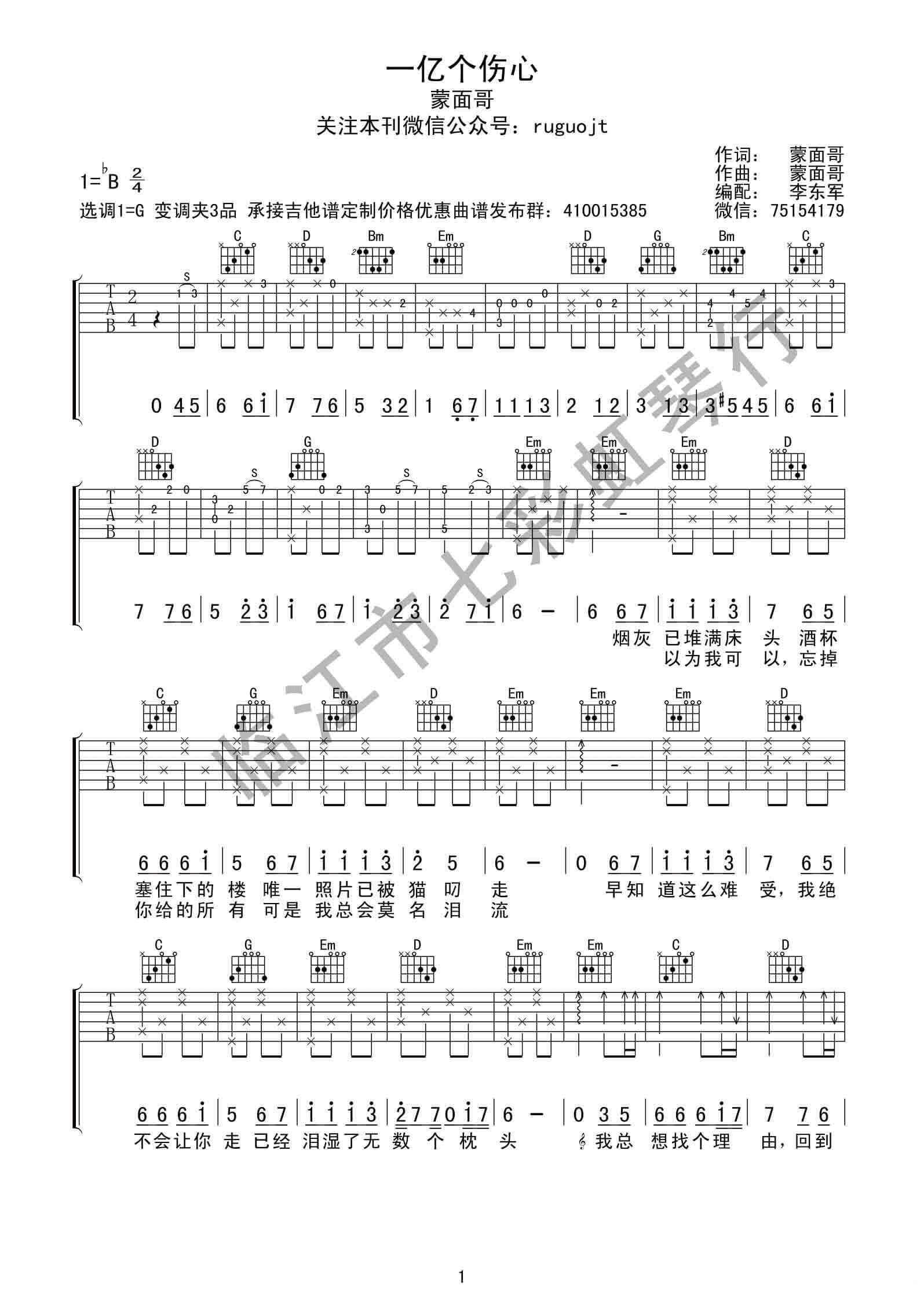 一亿个伤心吉他谱 - 蒙面哥 - G调吉他弹唱谱