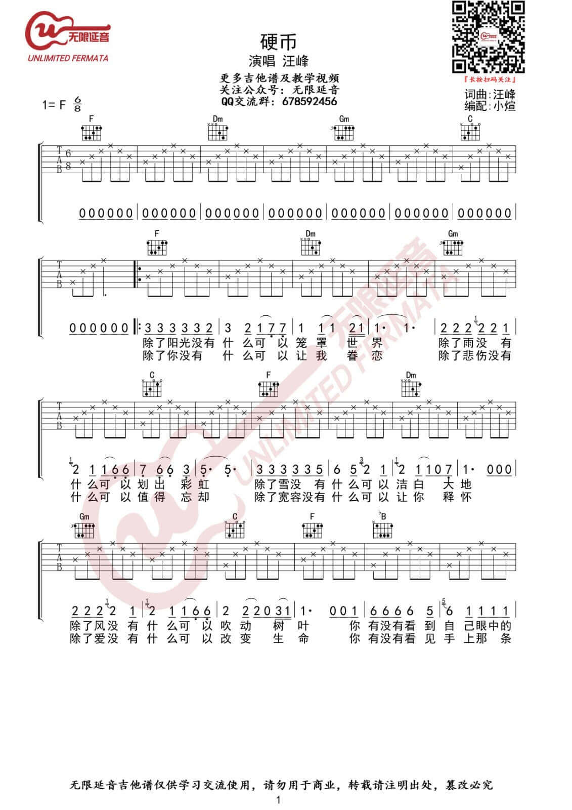 硬币吉他谱 - 汪峰 - F调吉他弹唱谱