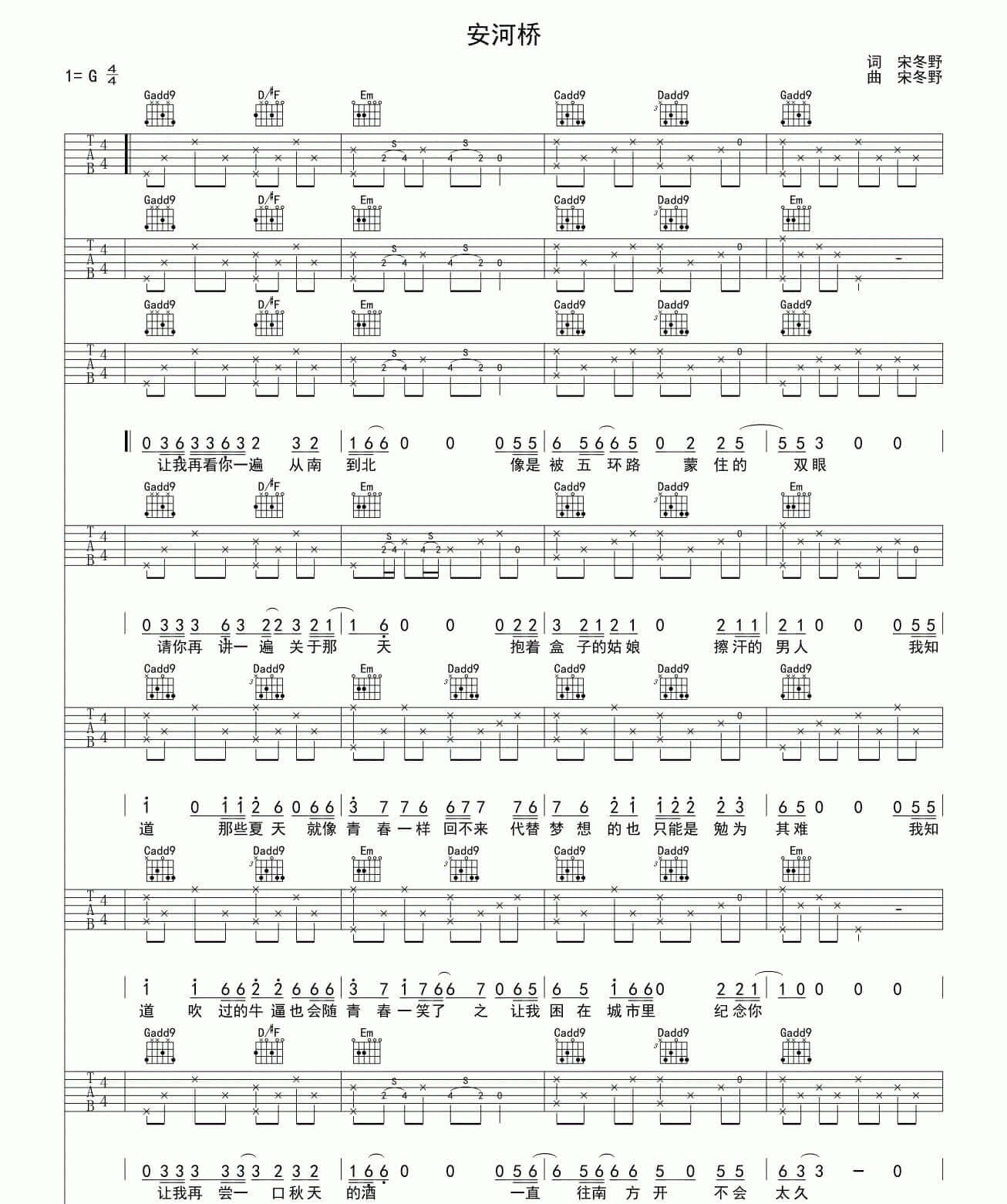 安河桥吉他谱 - 宋冬野 - G调吉他弹唱谱