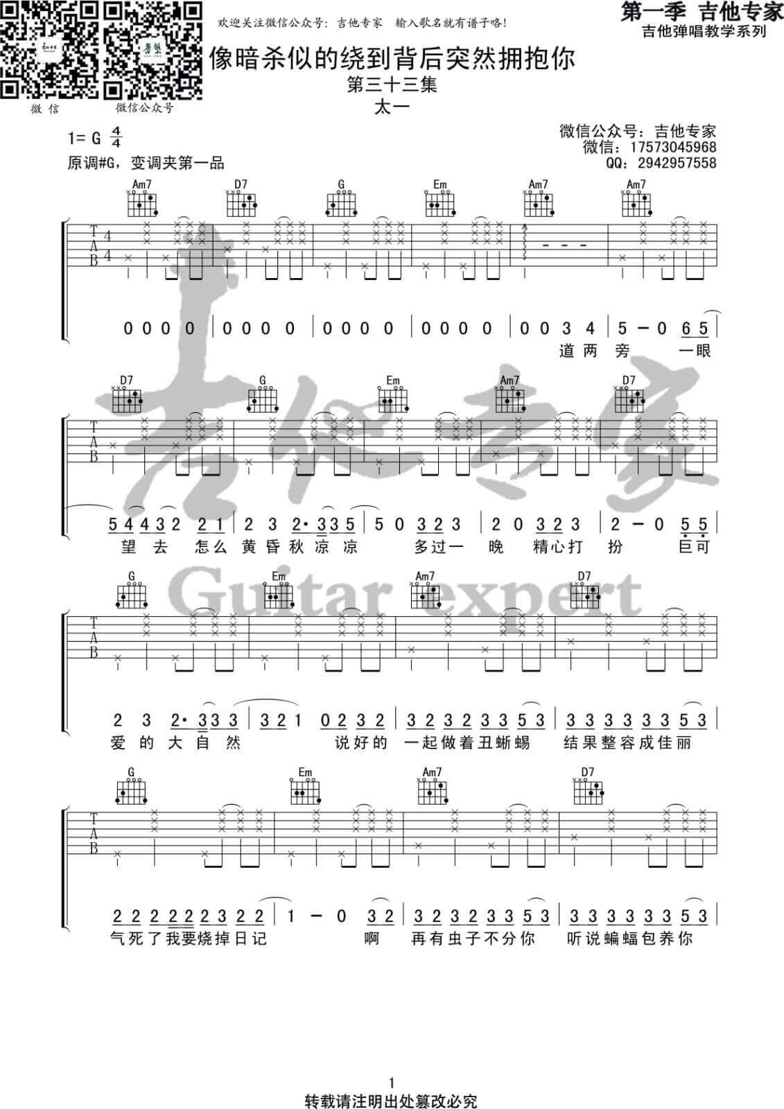 曲谱介绍: 像暗杀似的绕到背后突然拥抱你吉他谱由吉他专家编配完成,采用了G调指法。重要提示:Always吉他谱更新啦,学完这首后,顺便把下首学了吧。