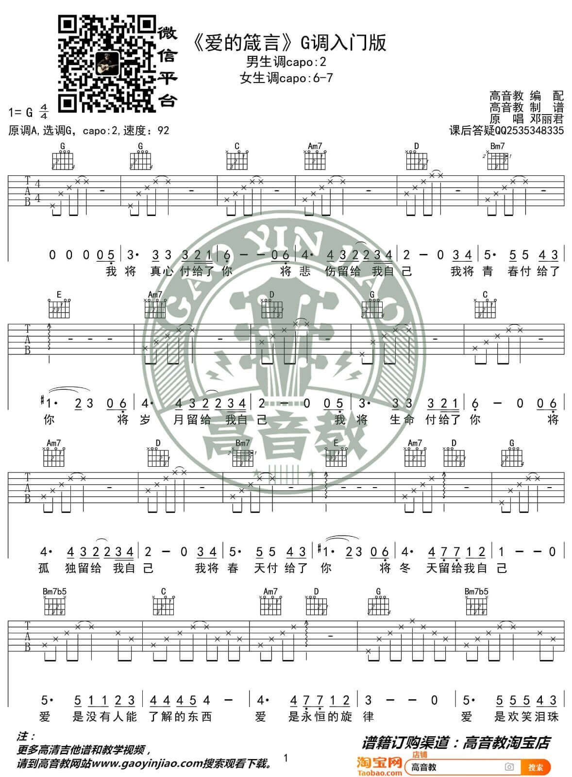 曲谱介绍: 爱的箴言吉他谱采用了G调指法,由高音教编配。这首十年吉他谱也很帅,快点去学习吧,没学会的小伙伴要继续加油喔,稳!