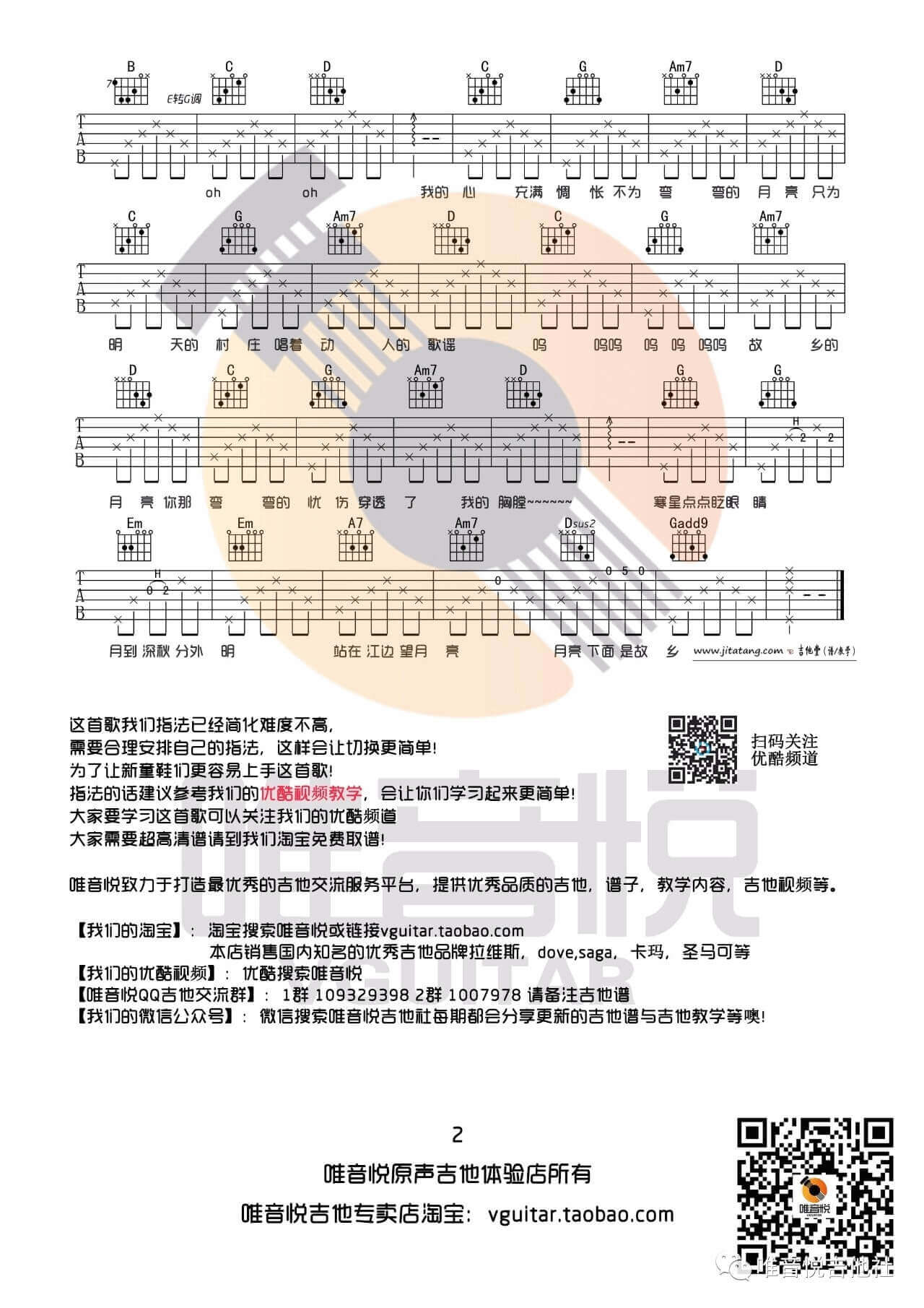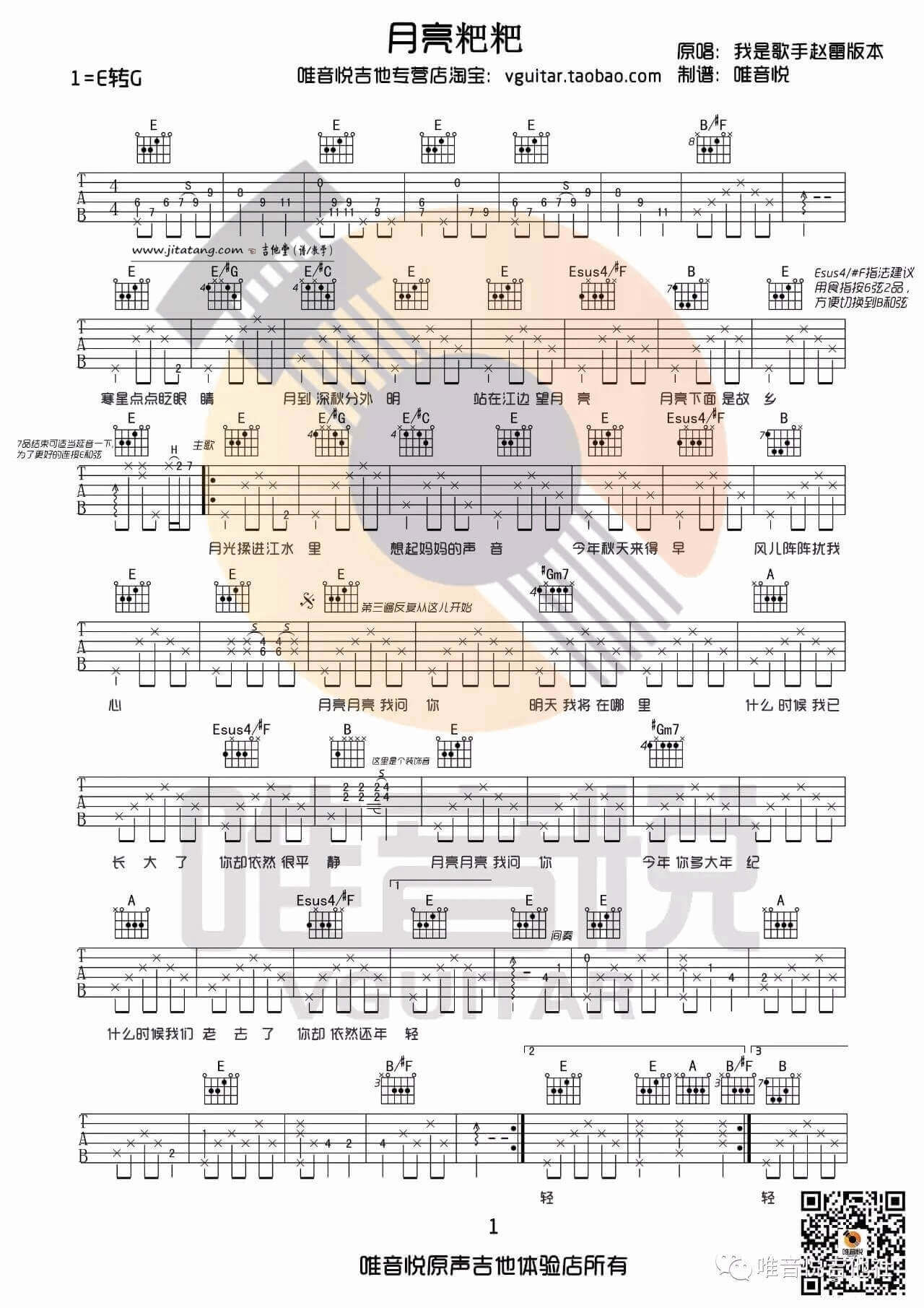 曲谱介绍: 月亮粑粑吉他谱采用了E转G调指法编配,由唯音悦提供,附带吉他视频教学。号外:在这里小编要推荐这首可可托海的牧羊人吉他谱,它也很好听,大家赶快学习起来啦,不要犹豫! 吉他弹唱演示及视频教学