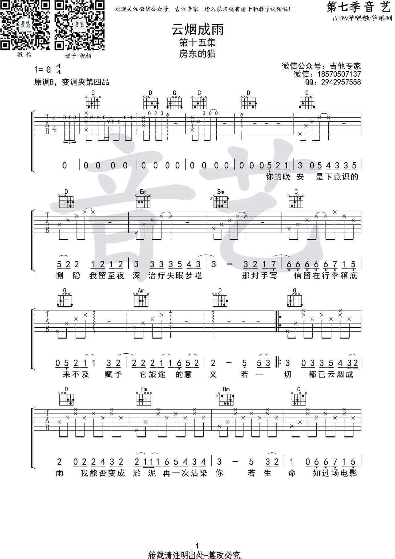云烟成雨吉他谱 - 房东的猫 - G调吉他弹唱谱