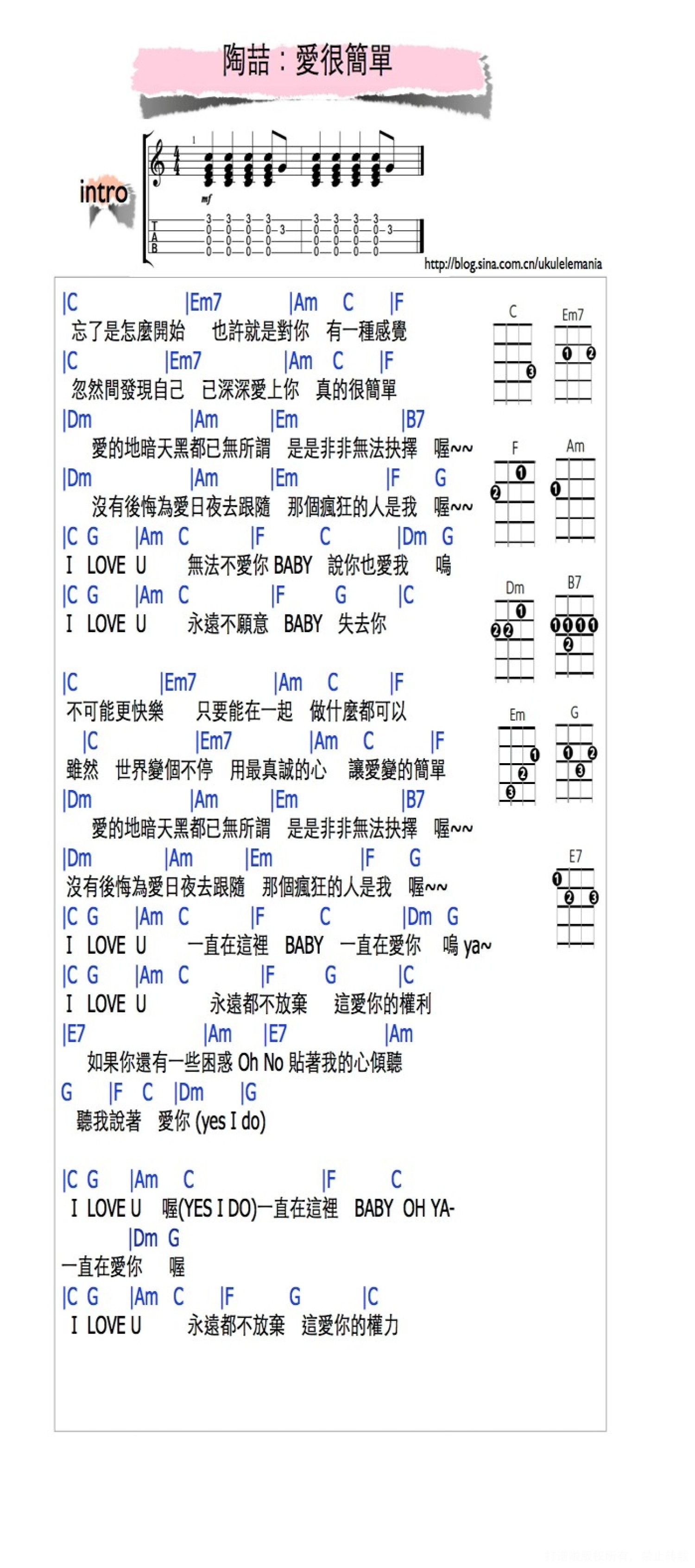 曲谱介绍: 《爱很简单》ukulele谱