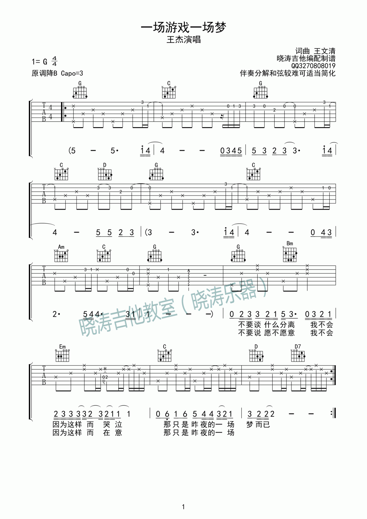 曲谱介绍: 王杰《一场游戏一场梦》吉他弹唱谱,采用G调指法编配,共有3张高清图谱。