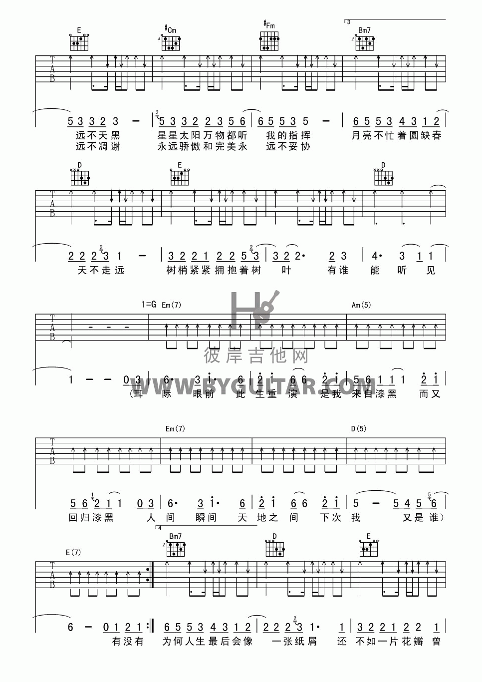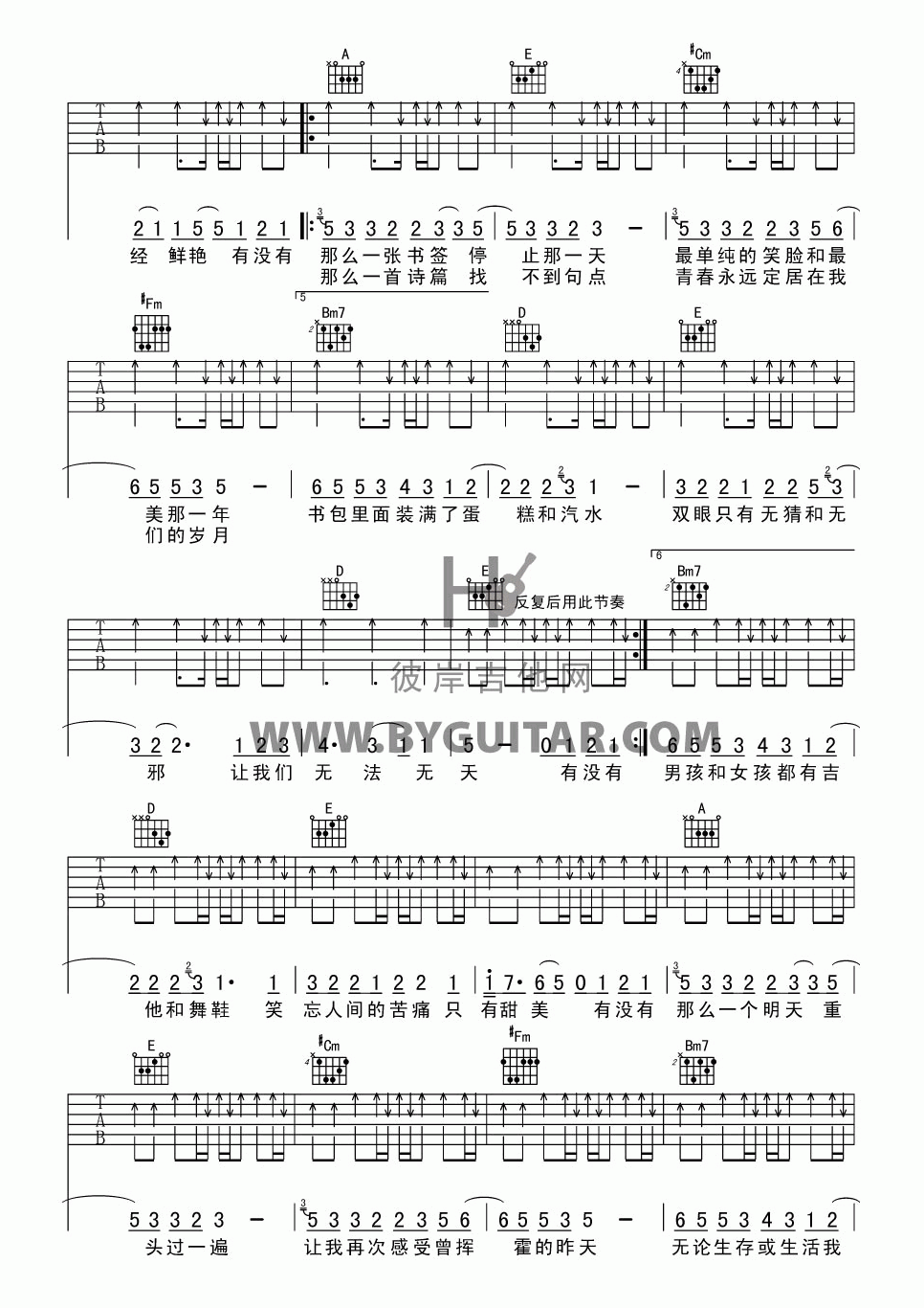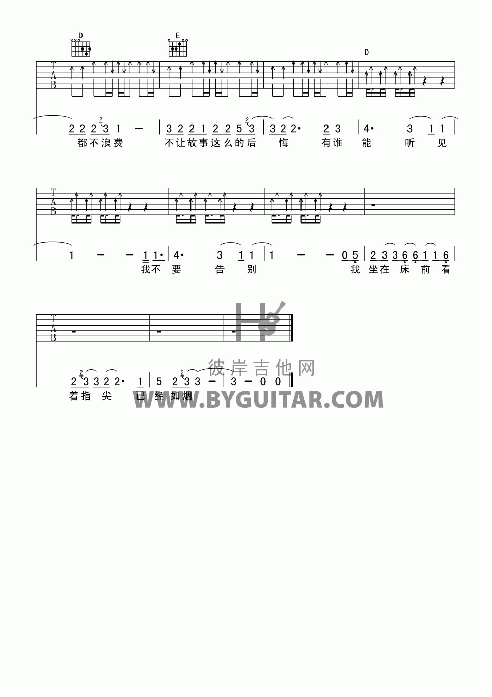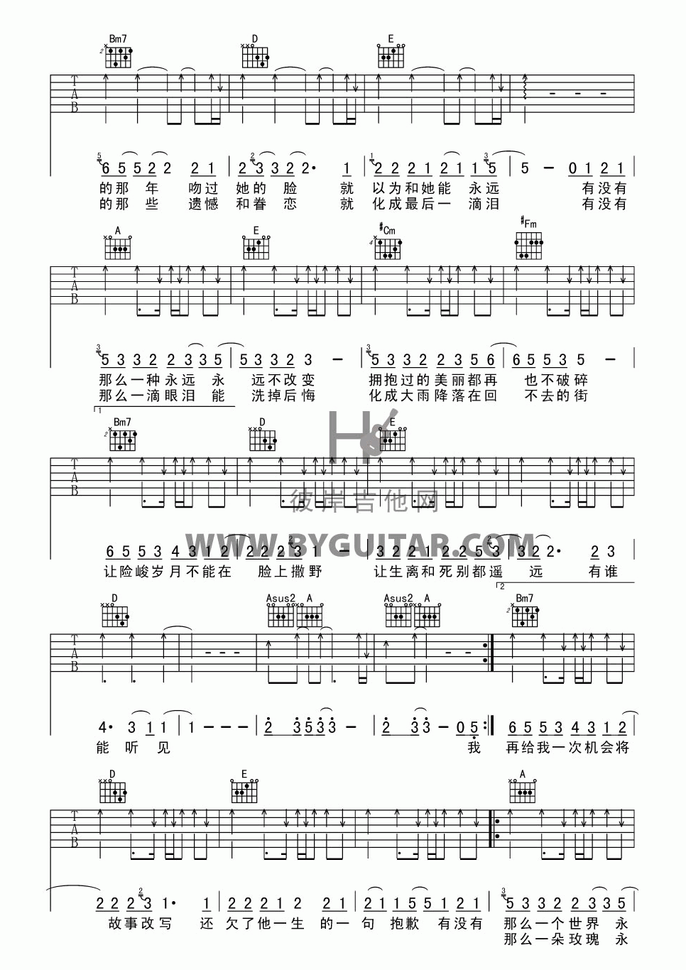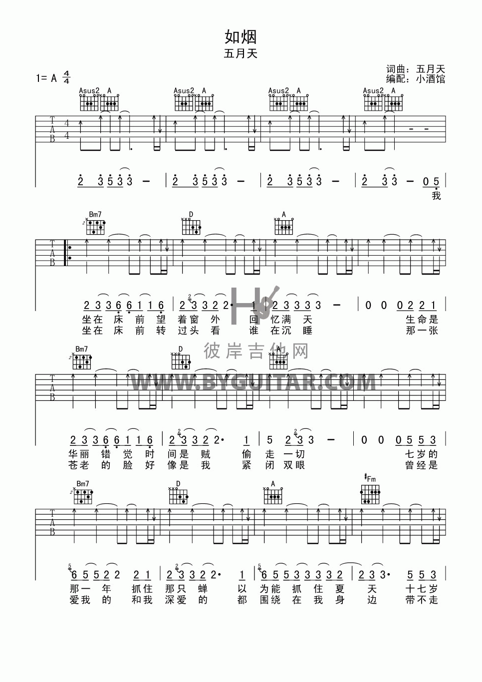 曲谱介绍: 五月天《如烟》吉他弹唱谱,采用A调指法编配,共有5张高清图谱。