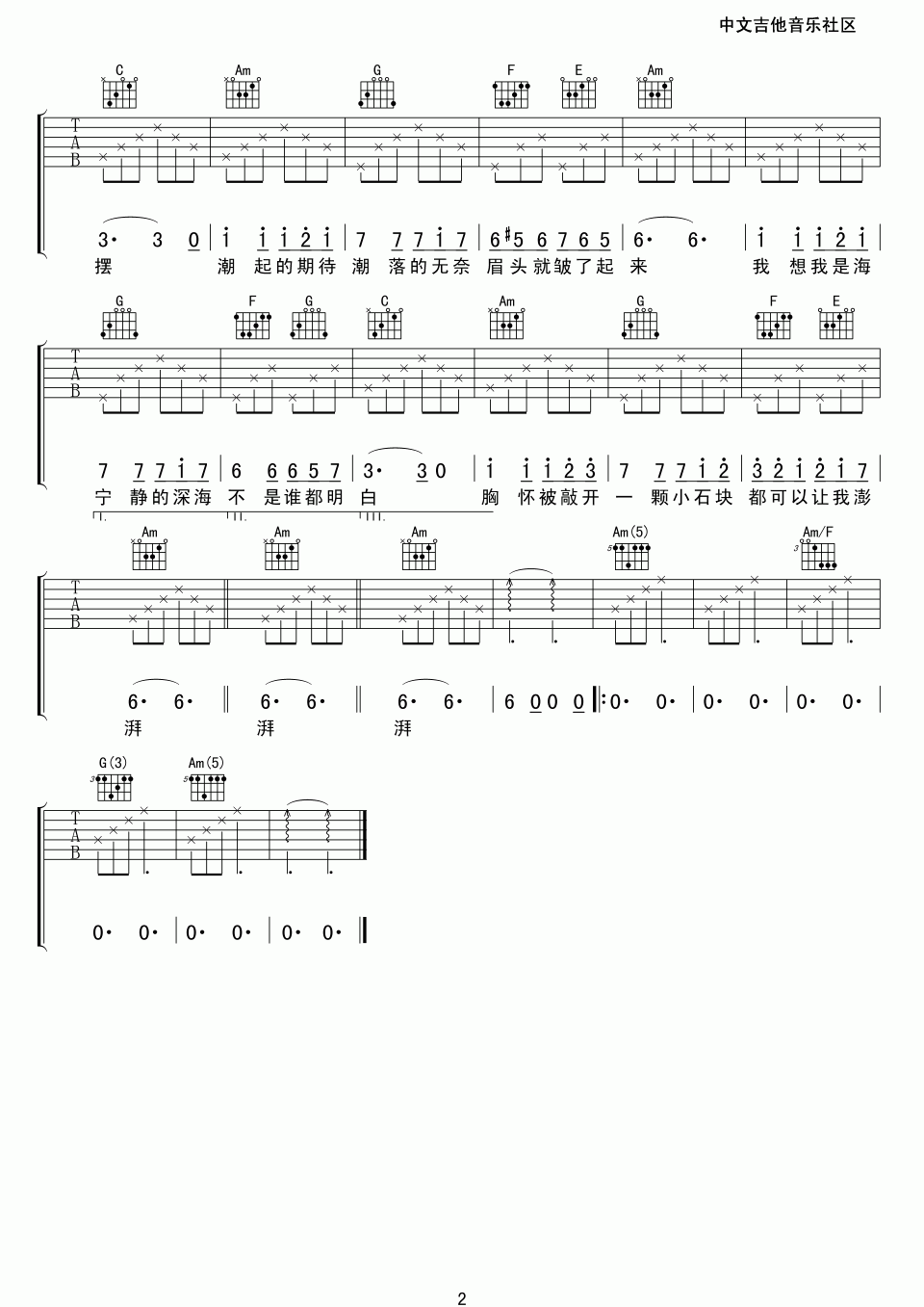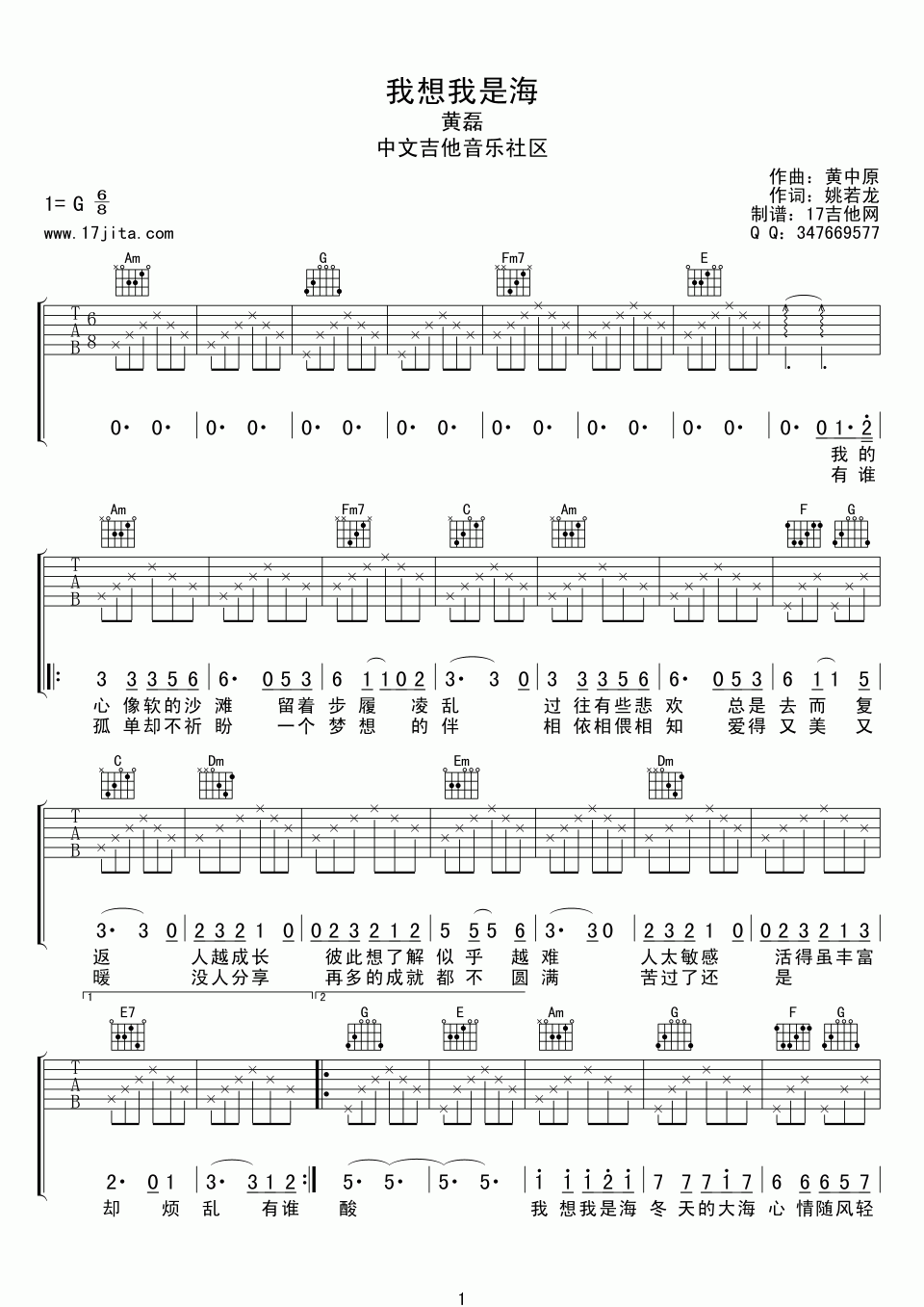曲谱介绍: 黄磊《黄磊我想我是海》吉他弹唱谱,采用G调指法编配,共有2张高清图谱,免翻页排版设计。