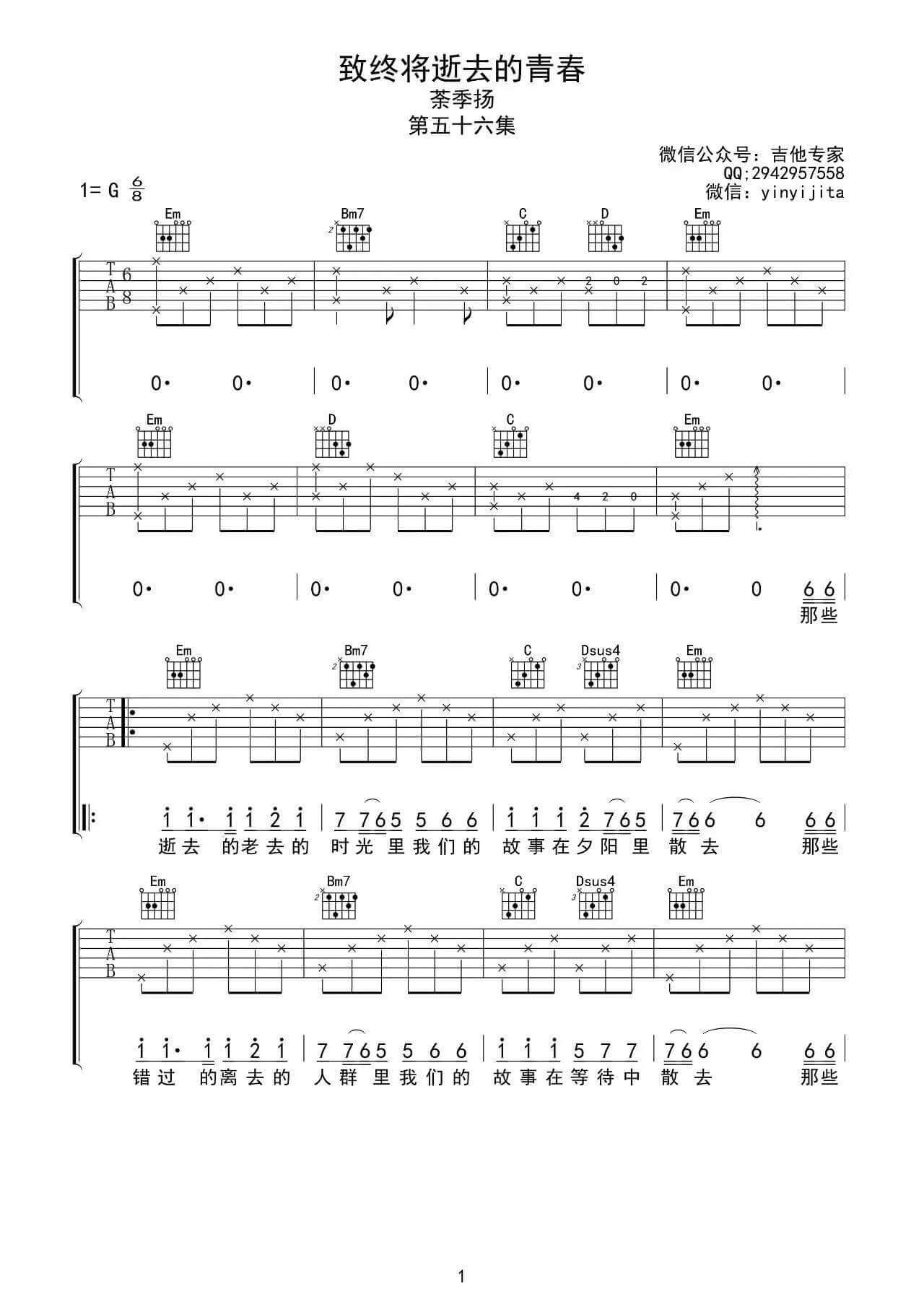 致终将逝去的青春吉他谱 - 茶季杨 - G调吉他弹唱谱