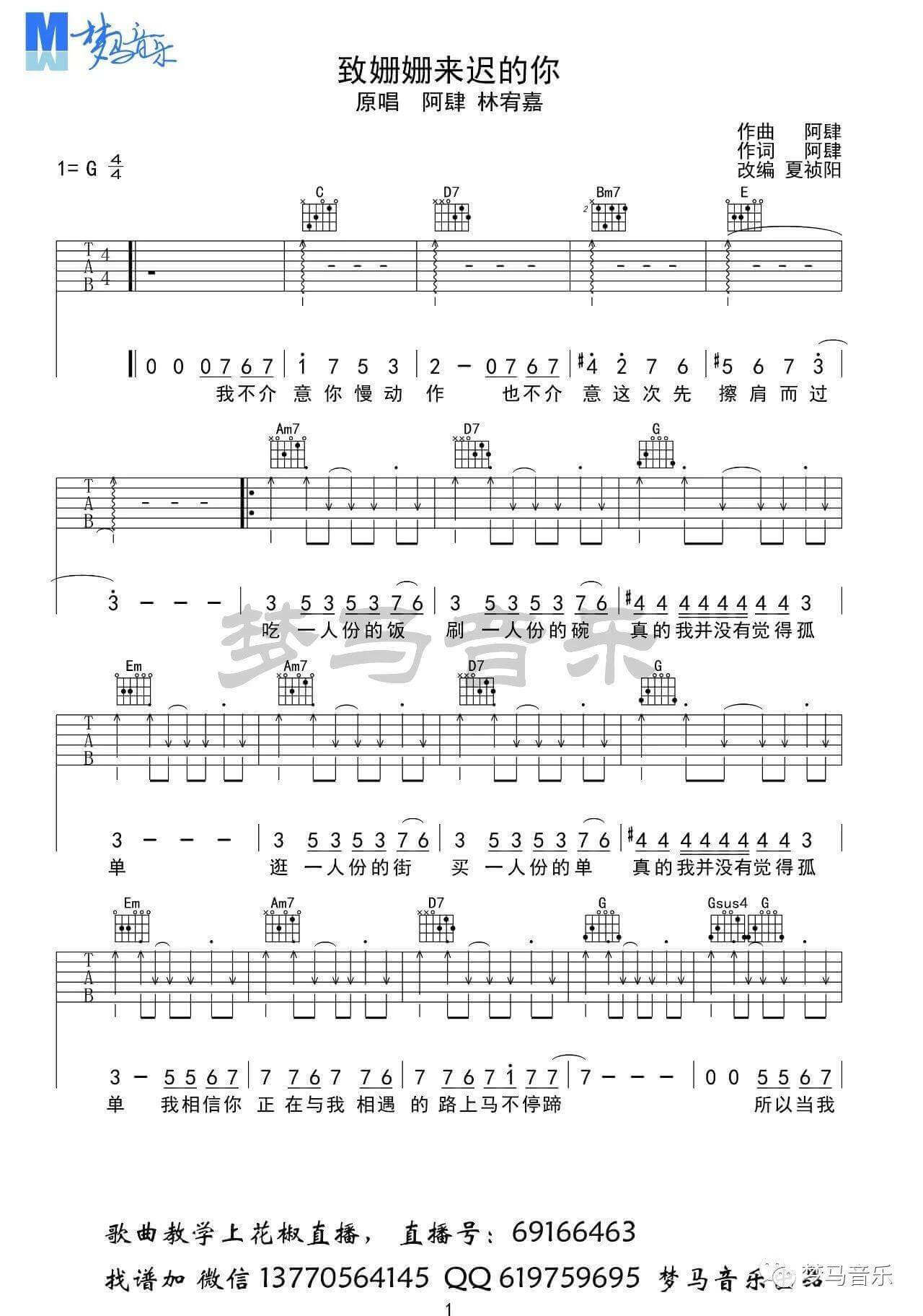 曲谱介绍: 致姗姗来迟的你吉他谱由梦马音乐编配完成,采用了G调指法。我都一次听这首致姗姗来迟的你是在2017的快乐男声,尹毓恪的声音深深打动了我,我点进去看完了整场视频,我开始关注这场快乐男声,后来又去了解了原版的致姗姗来迟的你,林宥嘉给我的感觉又是另外一种感受,号外:在这里小编要推荐这首会不会吉他谱,它也很好听,大家赶快学习起来啦,不要犹豫! 吉他弹唱演示及视频教学