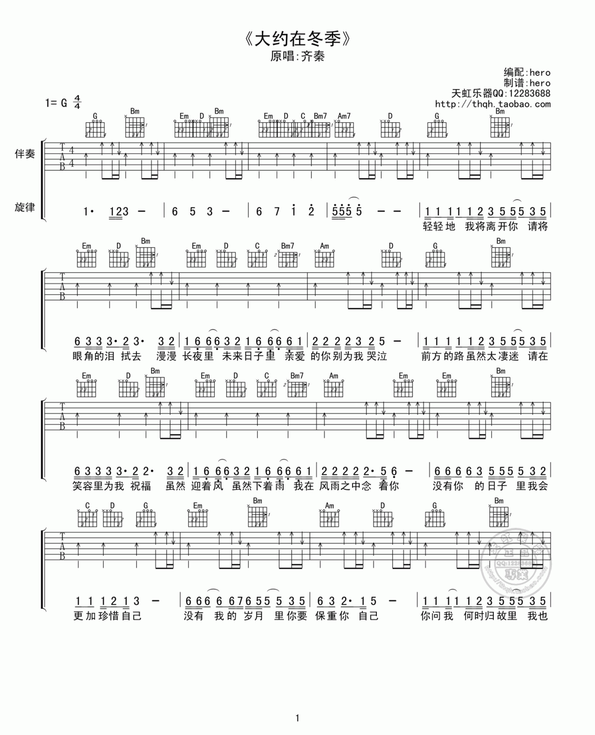 曲谱介绍: 齐秦《大约在冬季》吉他弹唱谱,采用G调指法编配,共有2张高清图谱,免翻页排版设计。