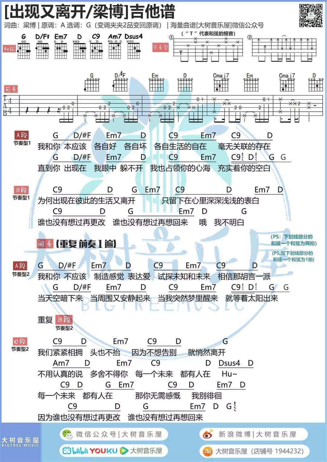 出现又离开吉他谱 - 梁博 - G调吉他弹唱谱