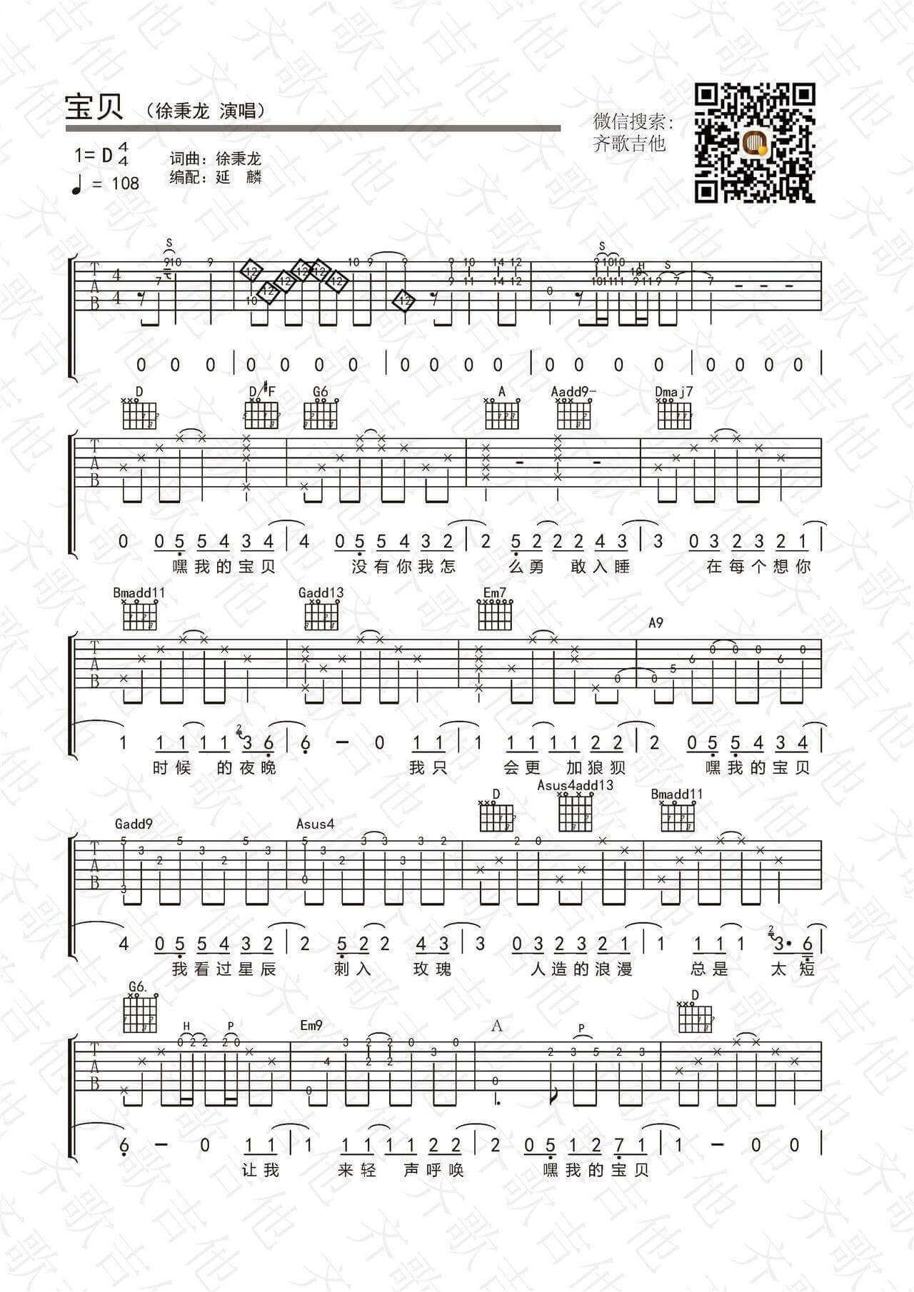 曲谱介绍: 徐秉龙的《宝贝》真的非常好听。歌手的人气非常不错。人气挺旺,歌曲质量也非常牛逼啦。虽然和弦进行依然是4536251这样的通俗套路,但是旋律的组织和吉他编配等等方面都有可圈可点的地方。听兄弟说,皆可吉他谱听了耳朵会怀孕,快快学起来,学完去撩妹! 吉他弹唱演示及视频教学