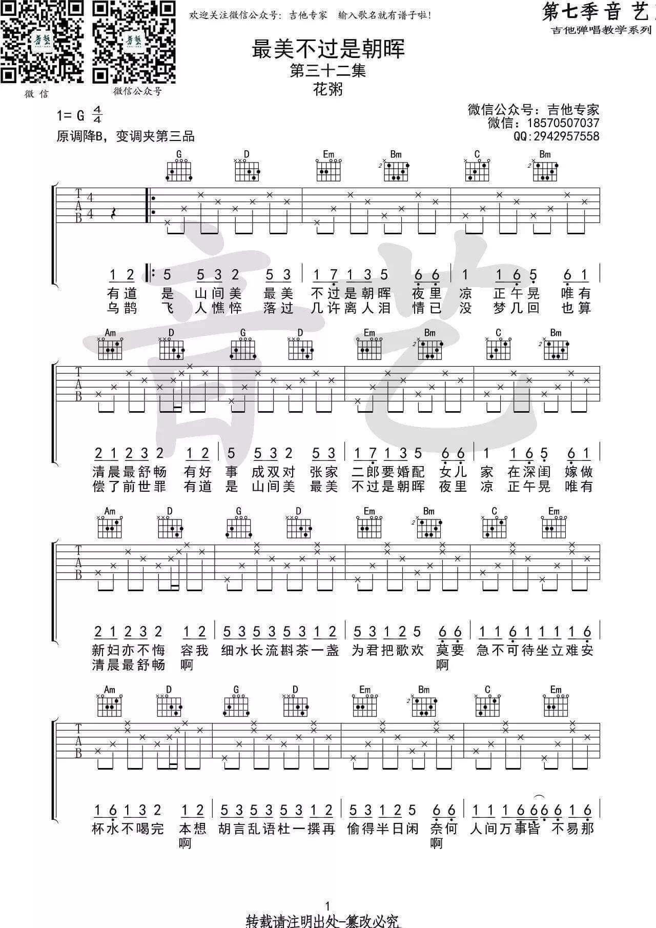 曲谱介绍: 最美不过是朝晖吉他谱原曲降B调,这个版本是第七季音艺编配的,采用了G调指法。花粥的每一首歌都好好听,这首最美不过是朝晖和她之前唱歌的风格差不多,整首歌是比较偏古风类型的歌曲,甜甜的又有点无力的声音听了很舒服,有点像催眠曲哈哈哈,好像是在讲一个人在自家的院子里虚度光阴,和自己的爱人,在充满古代风格的宅子里各种相见恨晚相敬如宾。真的很好听很好听的一首歌哦!号外:在这里小编要推荐这首祝你一路顺风吉他谱,它也很好听,大家赶快学习起来啦,不要犹豫!