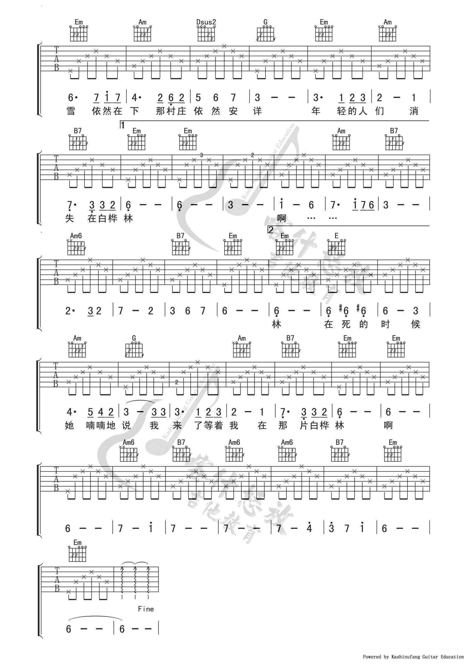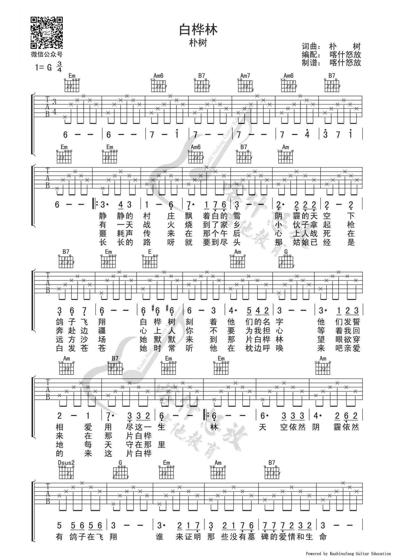 曲谱介绍: 朴树的《白桦林》真的是优美心碎却又让我无法放弃的歌曲,这首歌是我每天必备的单曲循环,不仅仅是因为朴树,更是因为这么优美的故事,这么动听的旋律。另外,和这首一样赞的谪仙吉他谱也非常NICE,大家快去学习吧!