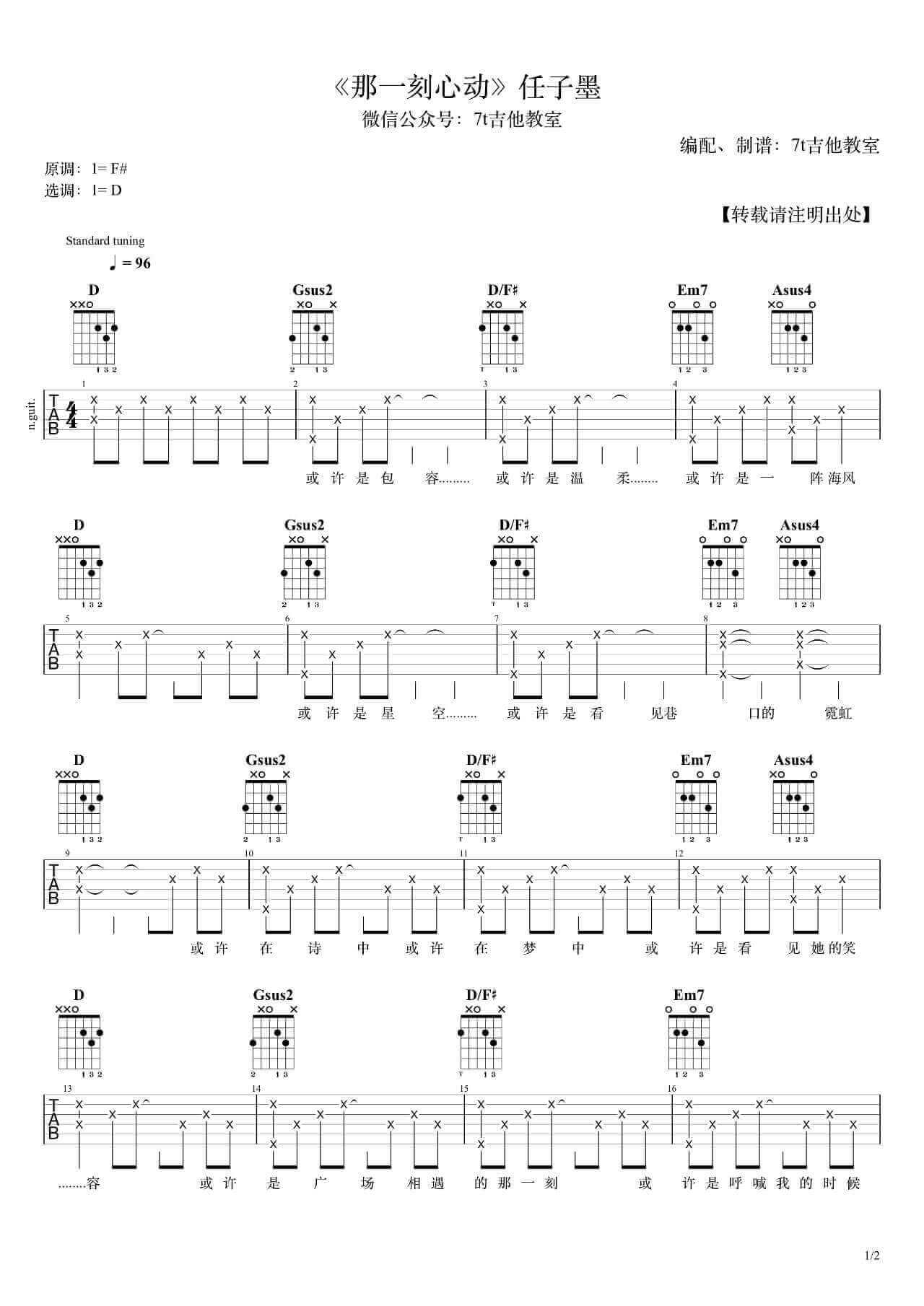 那一刻心动吉他谱 - 任子墨 - D调吉他弹唱谱