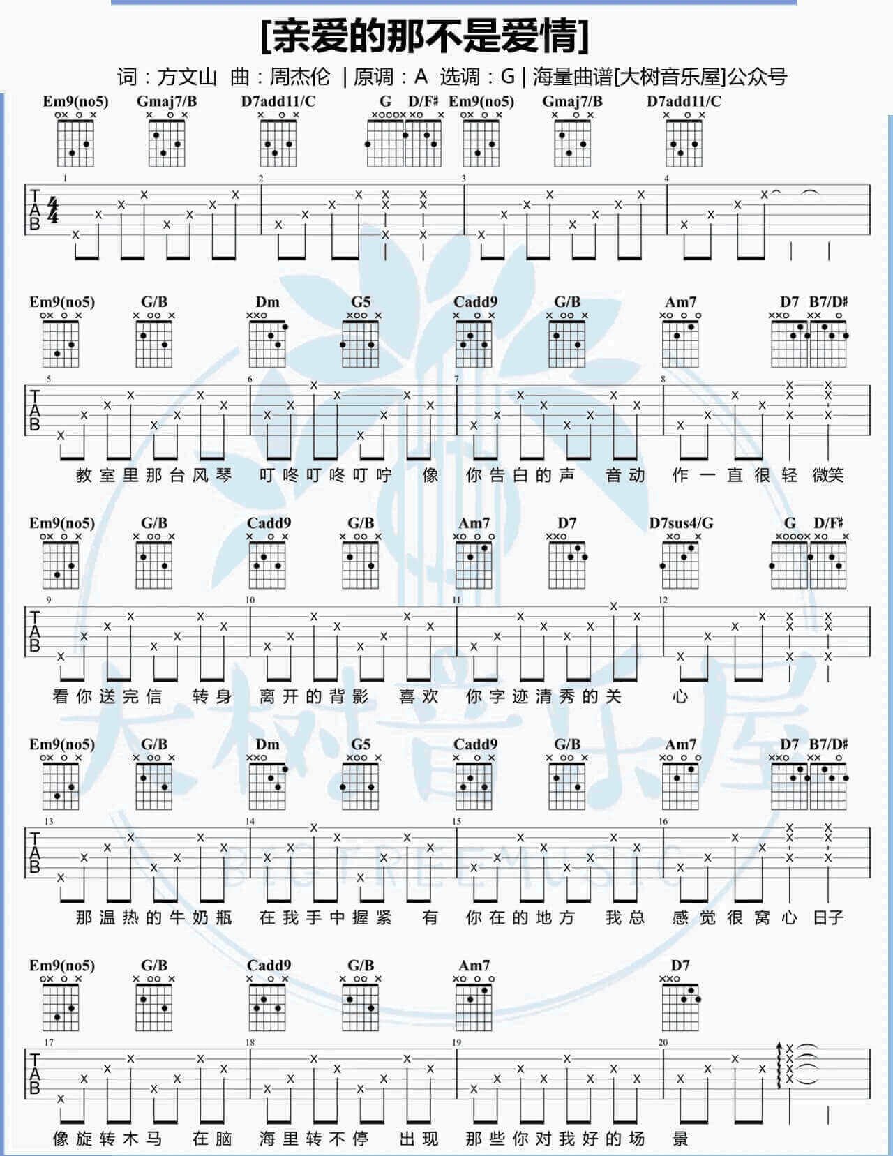 曲谱介绍: 《亲爱的那不是爱情》吉他谱原调A选用G,两张吉他谱图片。由音乐人周杰伦谱曲,方文山作词,张韶涵演唱的歌曲,发行于2021年5月31日。这首歌曲所属其个人第五张专辑《Ang 5.0》中。《亲爱的那不是爱情》这首歌由周杰伦为张韶涵特地量身打造的一首歌曲!张韶涵的慢板 R&B 唱腔曲风配合方文山一个特别的主题填词,张韶涵把这首歌诠释得很到位,深受歌迷们的喜爱。TIPS:在这里向大家推介另外一首,它就是暖味吉他谱啦,非常动听的一首曲子!