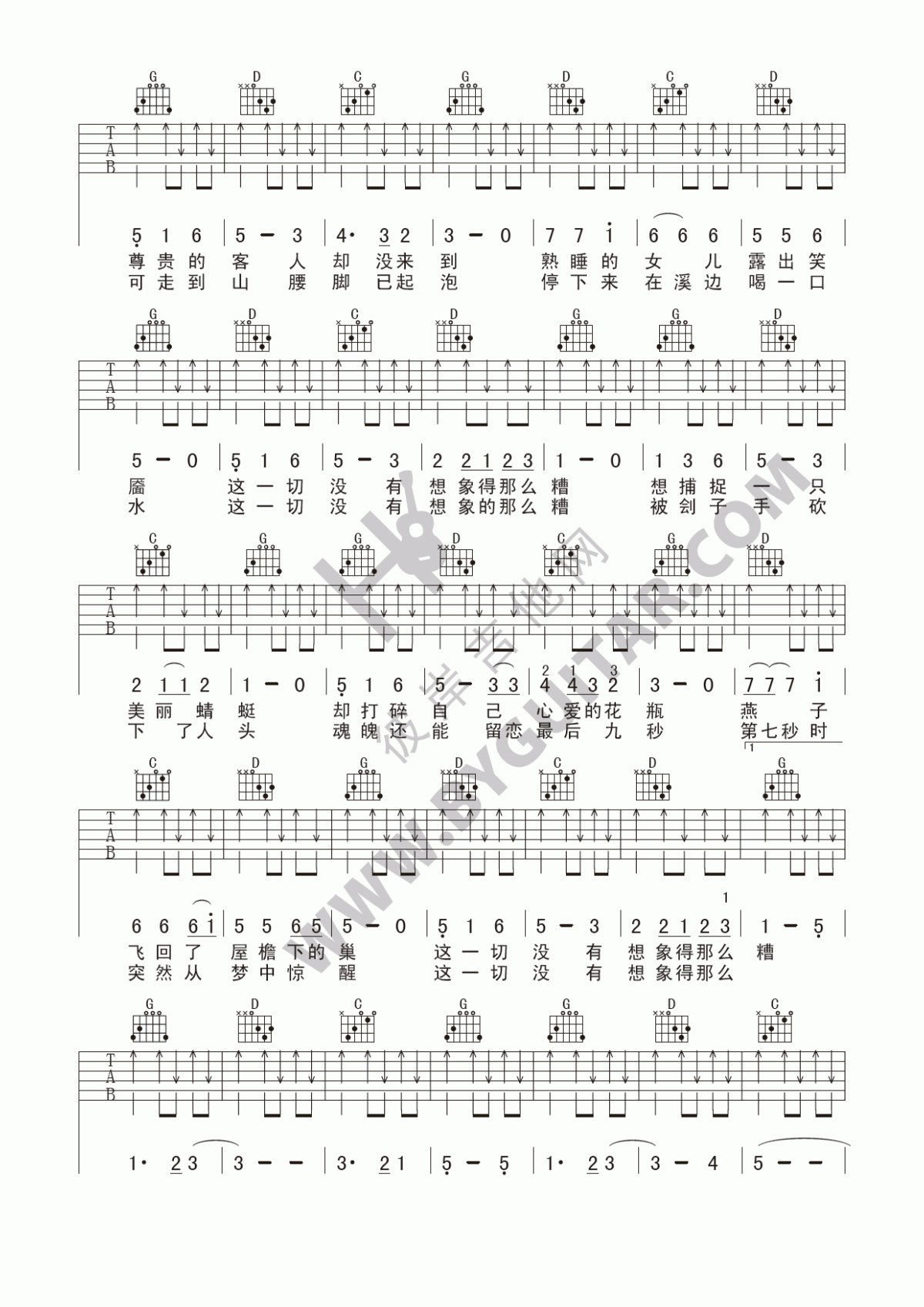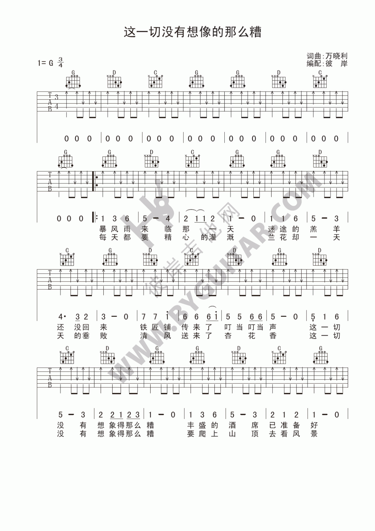 曲谱介绍: 万晓利《这一切没有想象的那么糟》吉他弹唱谱,采用G调指法编配,共有3张高清图谱。
