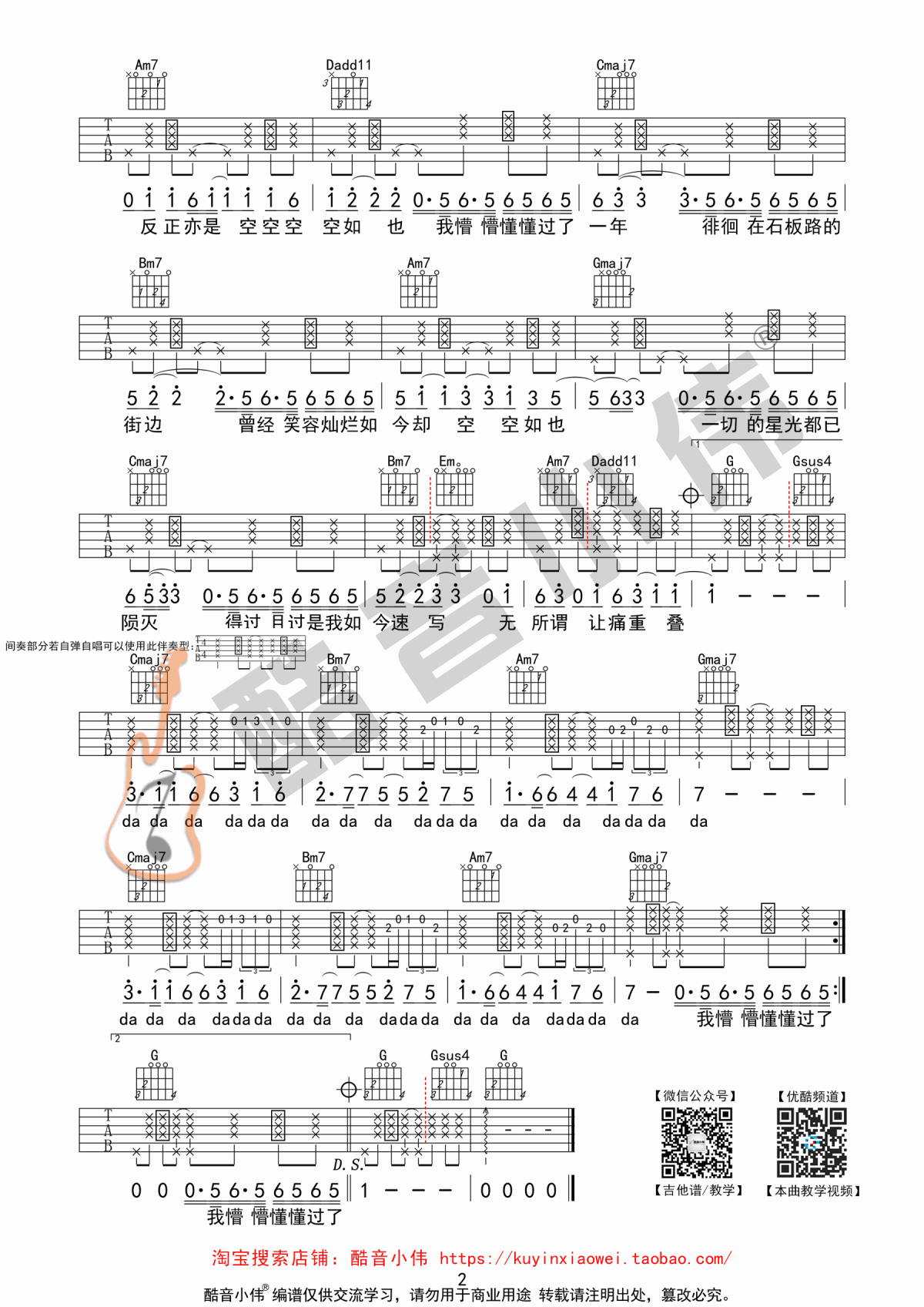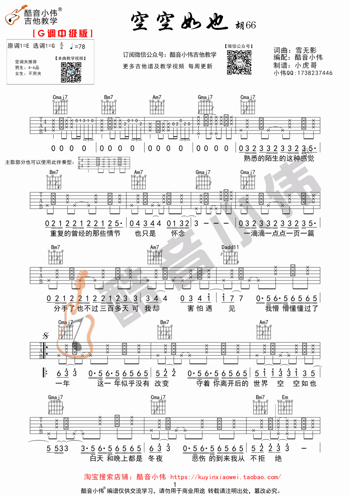 曲谱介绍: 空空如也吉他谱,选调C调指法,女生唱可将变调夹夹四/五品。胡66在网上演唱的一首流行歌曲,旋律简单,抓耳朵,吉他谱空,画面清晰,六行谱,适合男孩,视个人情况而定。感谢您编辑的深蓝色雨吉他,网站建议上传。表演技巧:歌曲表演中最难的部分是节奏的协调。建议练习后使用节拍器。更正。第二个困难是切割技术。如果感觉困难,可以换成节拍。