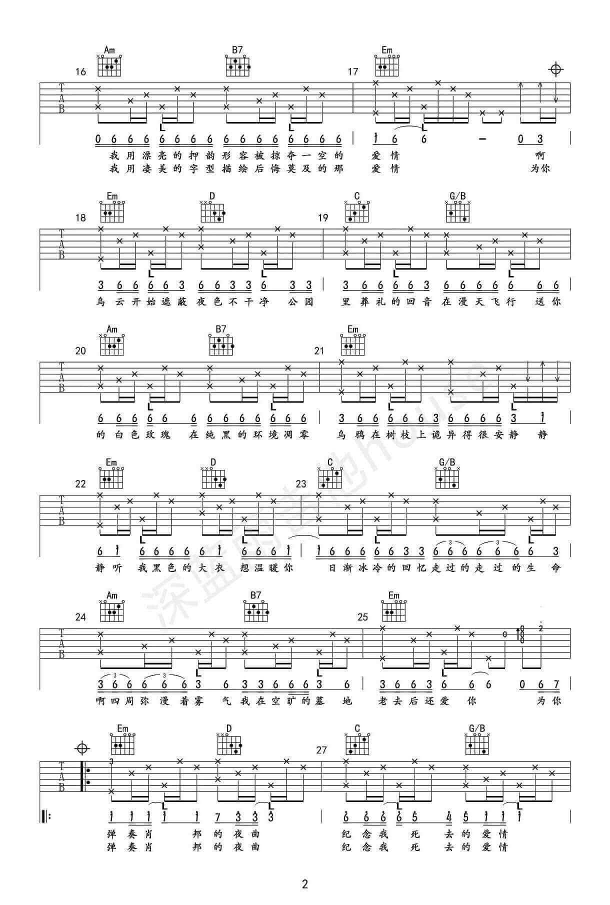 曲谱介绍: 《夜曲》吉他谱选用G调指法编配,三张吉他谱图片。由方文山作词,周杰伦作曲,林迈可编曲,周杰伦演唱的歌曲,发行于2005年11月1日。这首歌曲所属音乐专辑《11月的萧邦》中。《夜曲》这首歌作为是《十一月的萧邦》中最早完成的作品,运用了周杰伦扎实的古典底子,加上方文山的作词,结合流行音乐音素,深受歌迷的强烈称赞!听说,有魅力的帅哥美的都在悄悄练这首不知所措吉他谱,小伙伴们也快练起来吧~