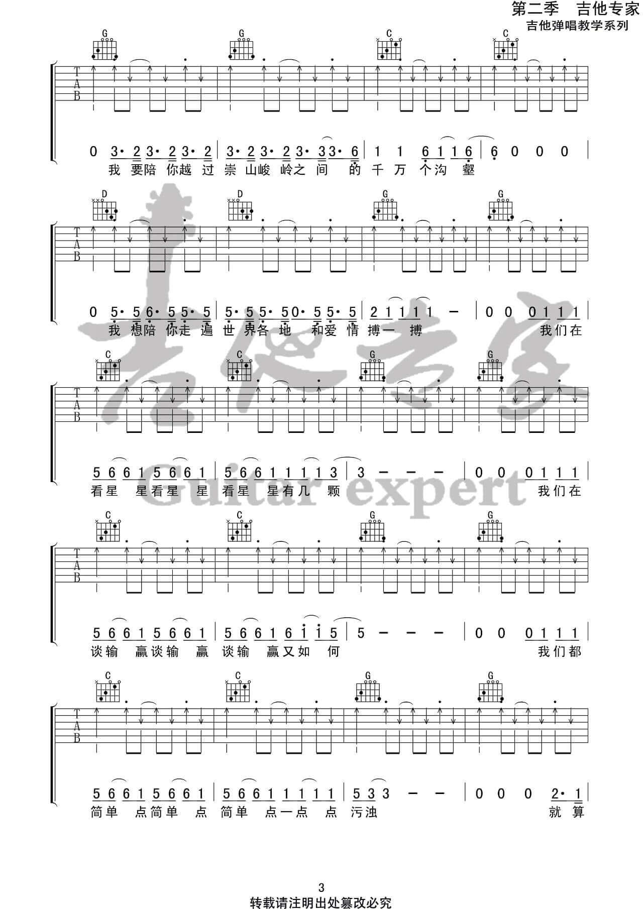 曲谱介绍: 我想陪你看天上的星星 还有几颗,我想和你度过漫长岁月看遍星河。隔壁老樊新歌《分手跳跃》,唱着分手后对恋爱中看风景、数星星的美好回忆。 来自吉他专家编配《分手跳跃》吉他谱,G调指法六线谱,下上下上的扫弦伴奏起伏不定,和弦也非常简单。