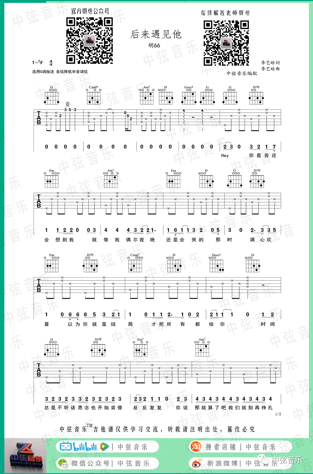 曲谱介绍: 来自中弦音乐编配《后来遇见他》吉他谱,本首歌曲采用G调指法编配,编配难度初学,大家可以弹起来!