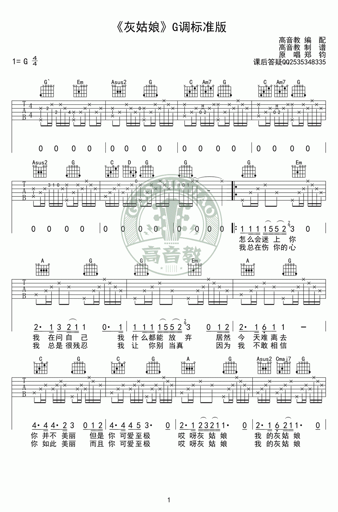 曲谱介绍: 灰姑娘《灰姑娘_G调》吉他弹唱谱,采用G调指法编配,共有2张高清图谱,免翻页排版设计。