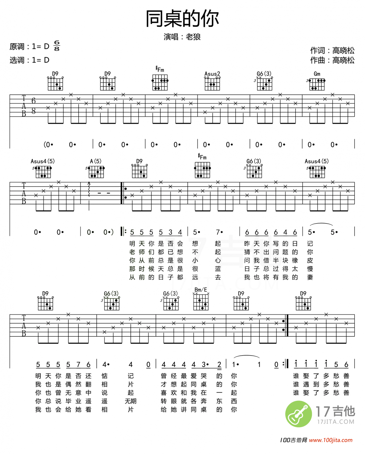 同桌的你吉他谱 - 老狼 - D调吉他弹唱谱 - 原版