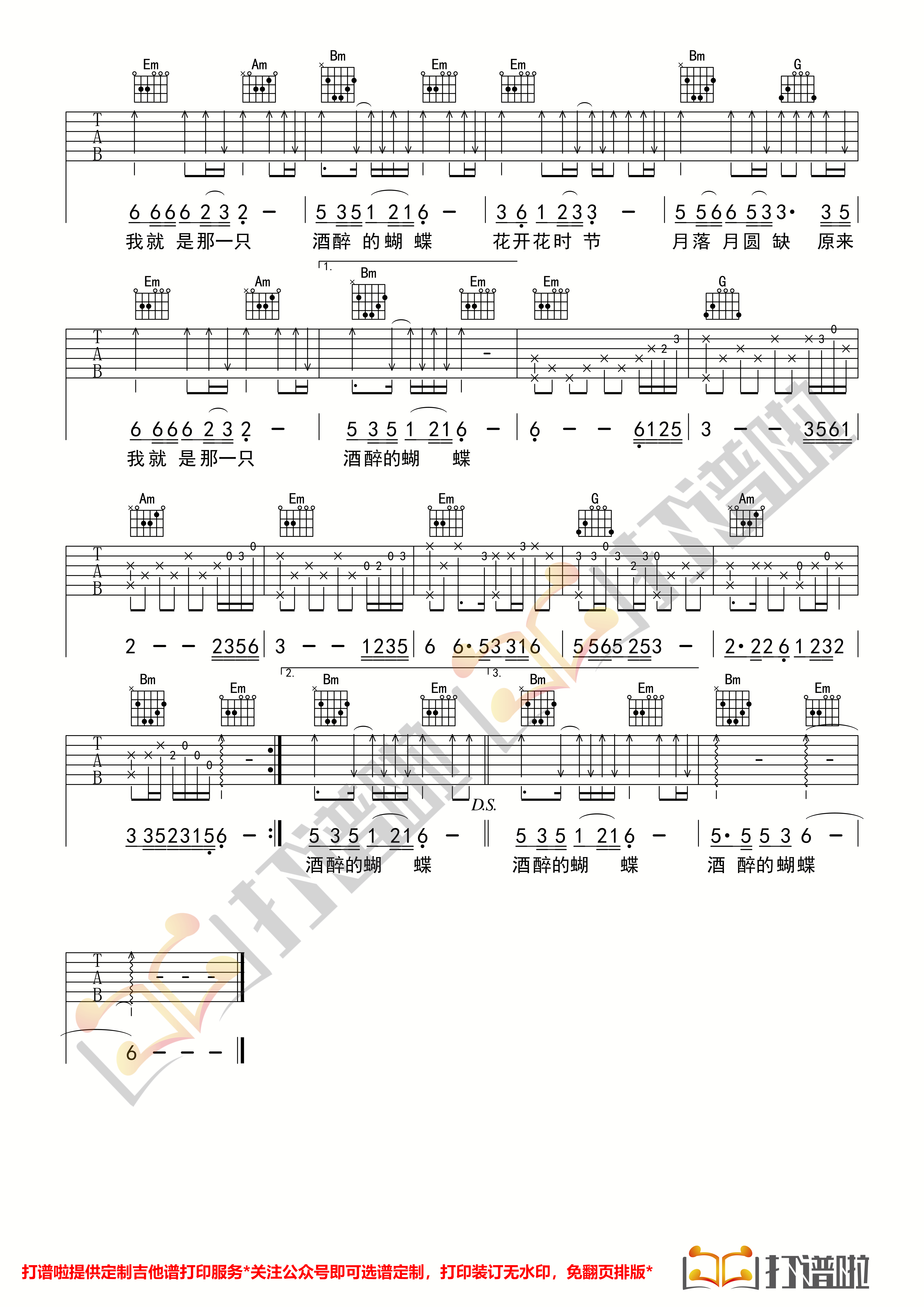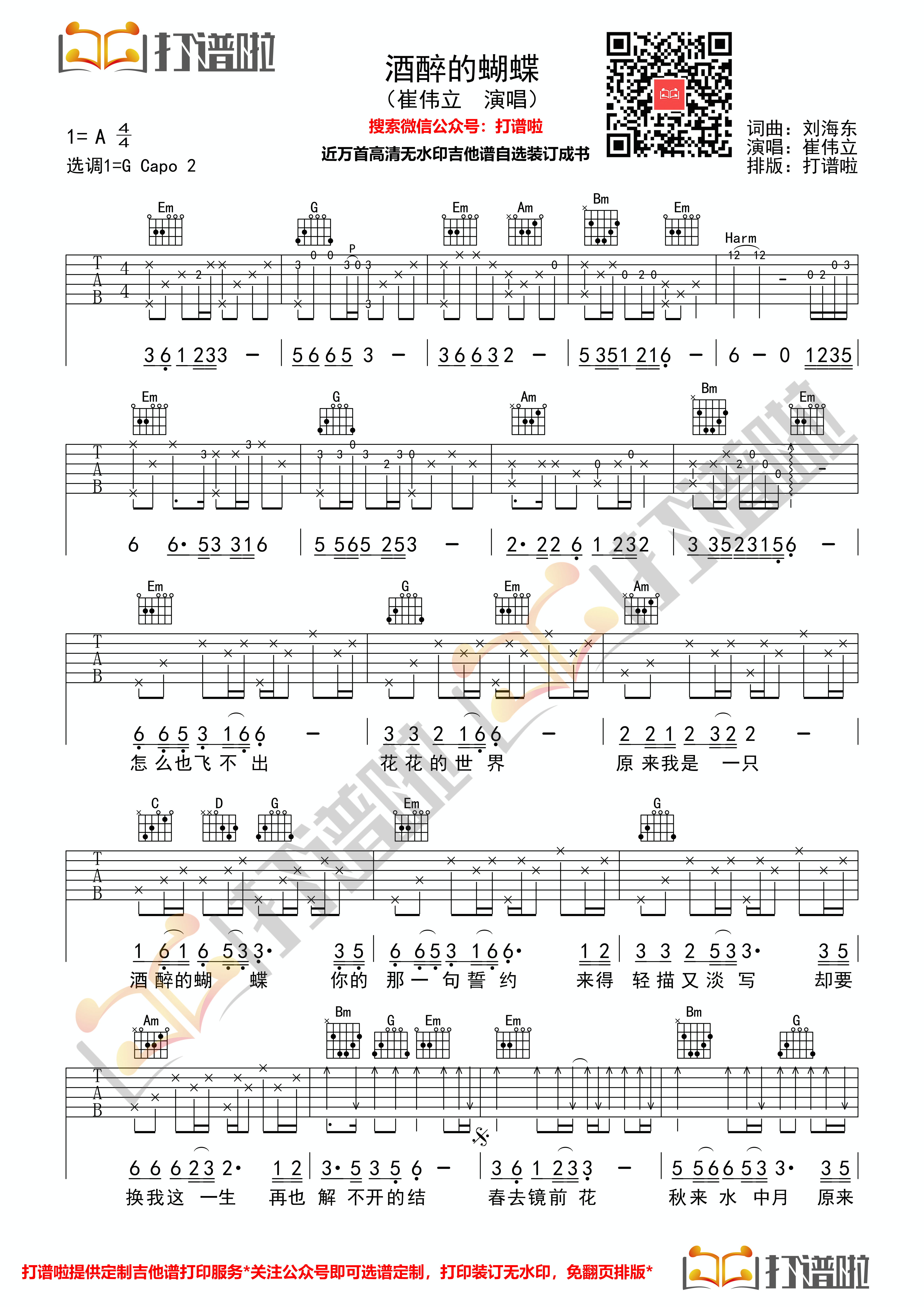 曲谱介绍: 崔伟立《酒醉的蝴蝶》,优美的旋律,略带伤感的画面感,加上歌手的深情演唱,深受网友的喜爱。 来自打谱啦编配《酒醉的蝴蝶》吉他谱,G调指法版,变调夹夹第二品弹唱。