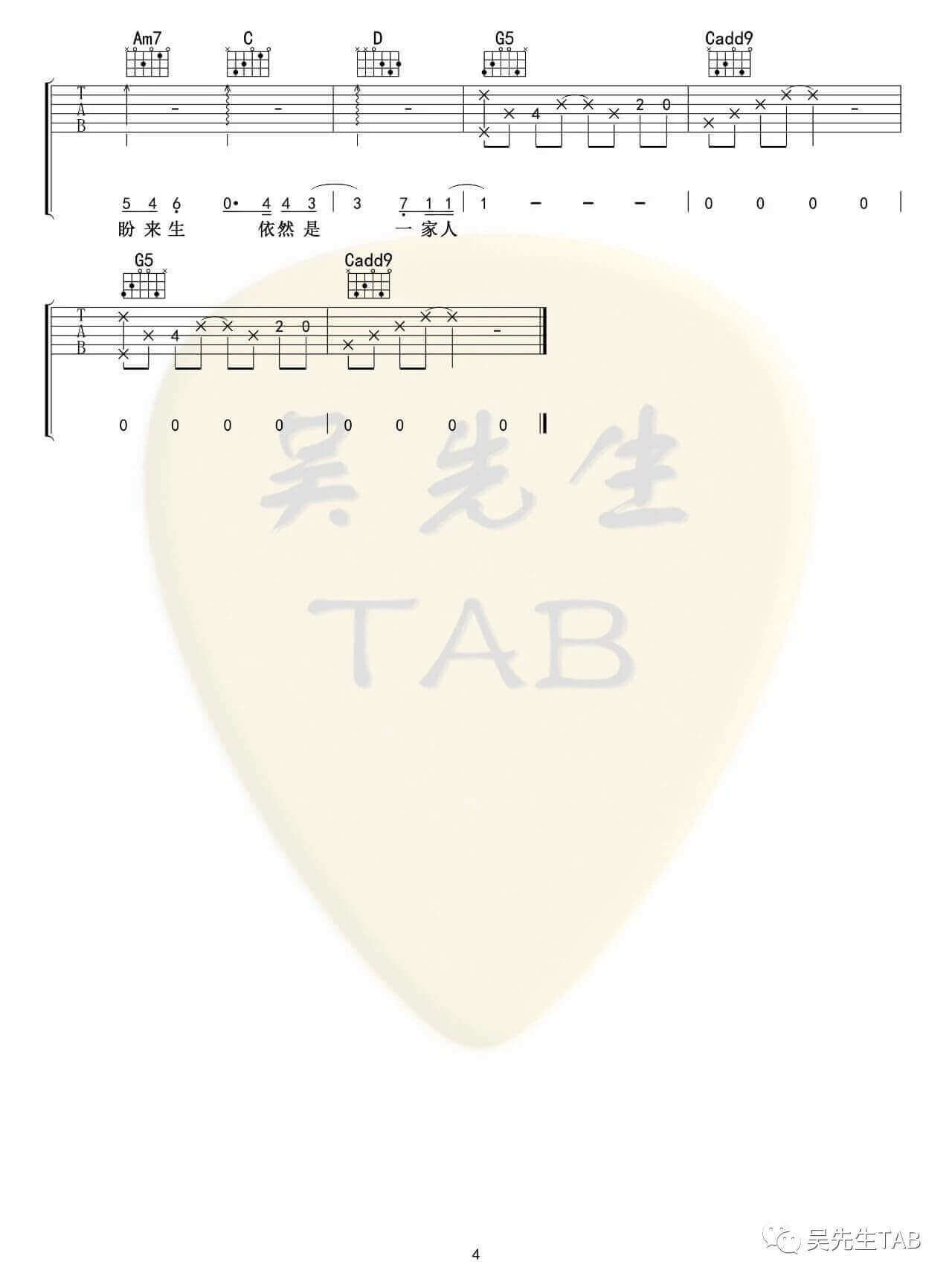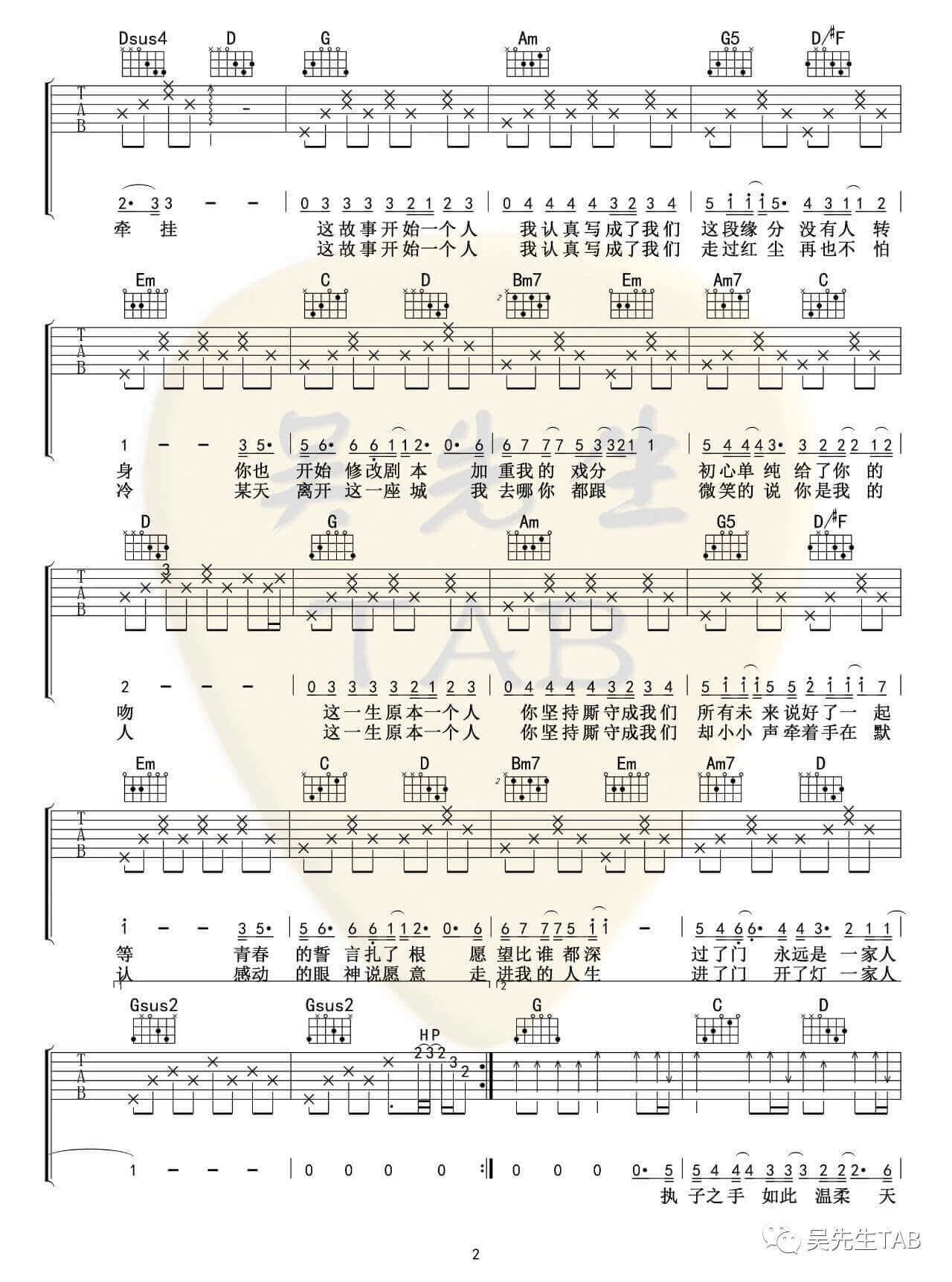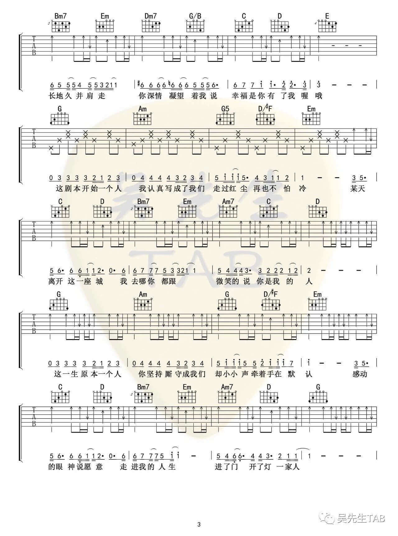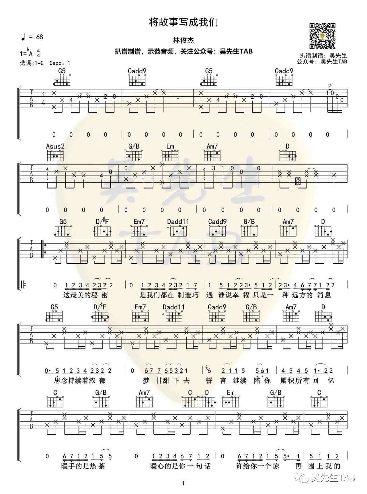 曲谱介绍: 来自吴先生编配《将故事写成我们》吉他谱分享,G调弹唱伴奏谱,原调bA调,弹唱变调夹夹第一品,速度每分钟68拍。