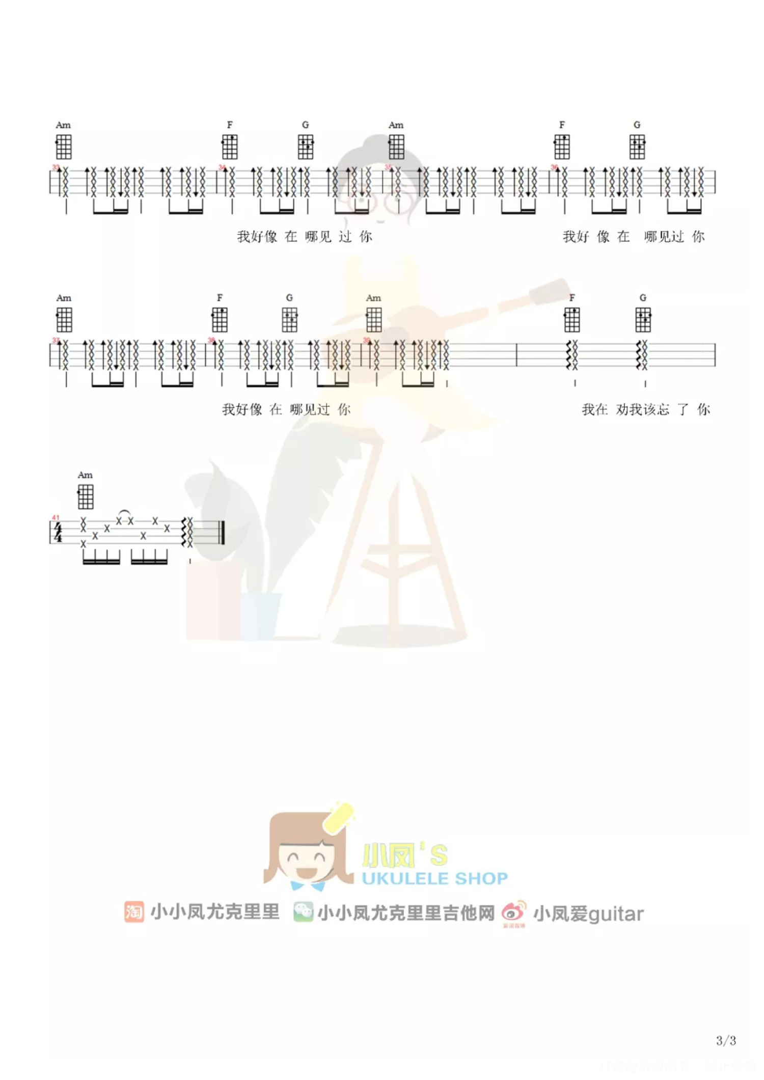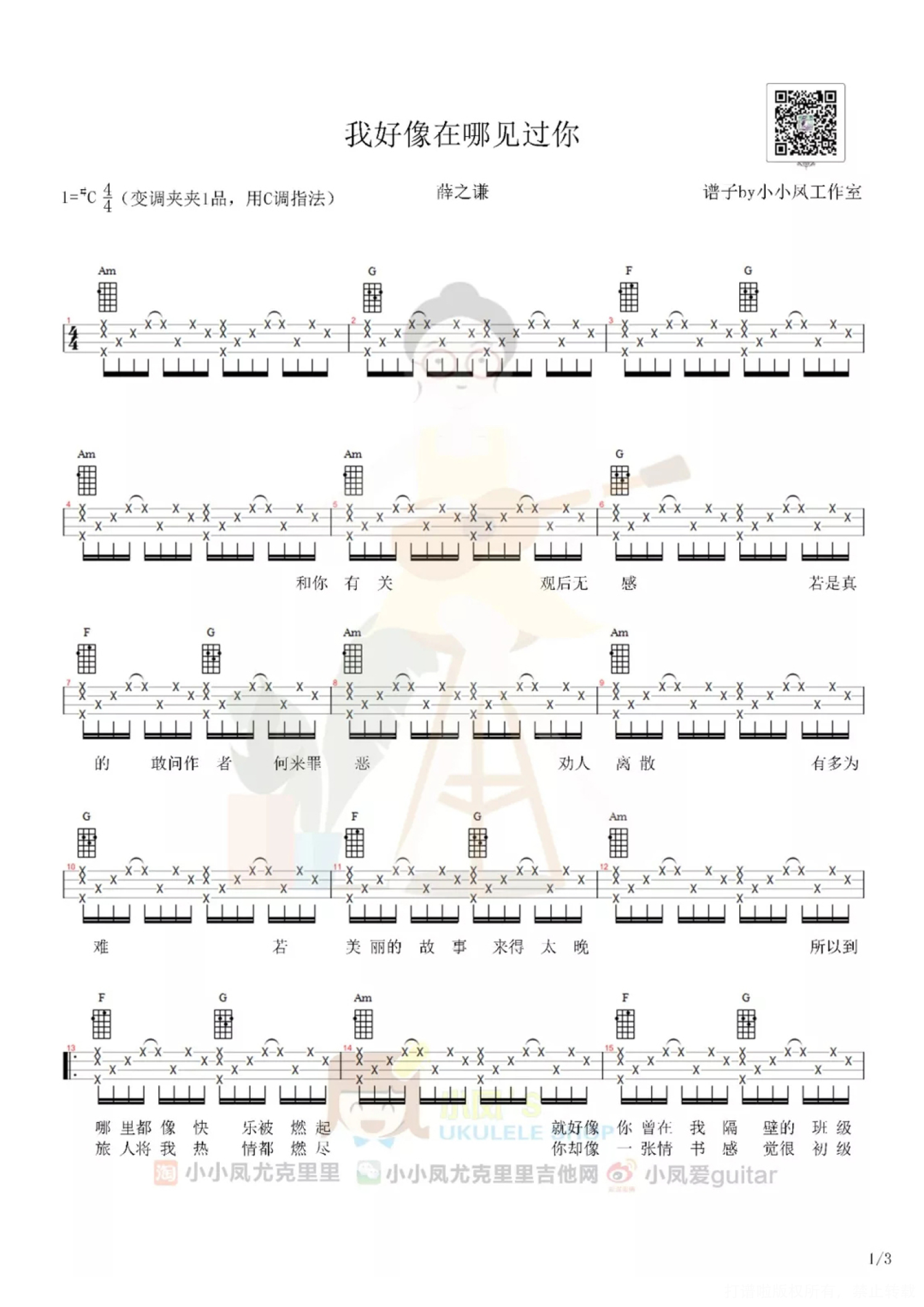 曲谱介绍: 薛之谦《我好像在哪见过你》_C调尤克里里谱_简单版