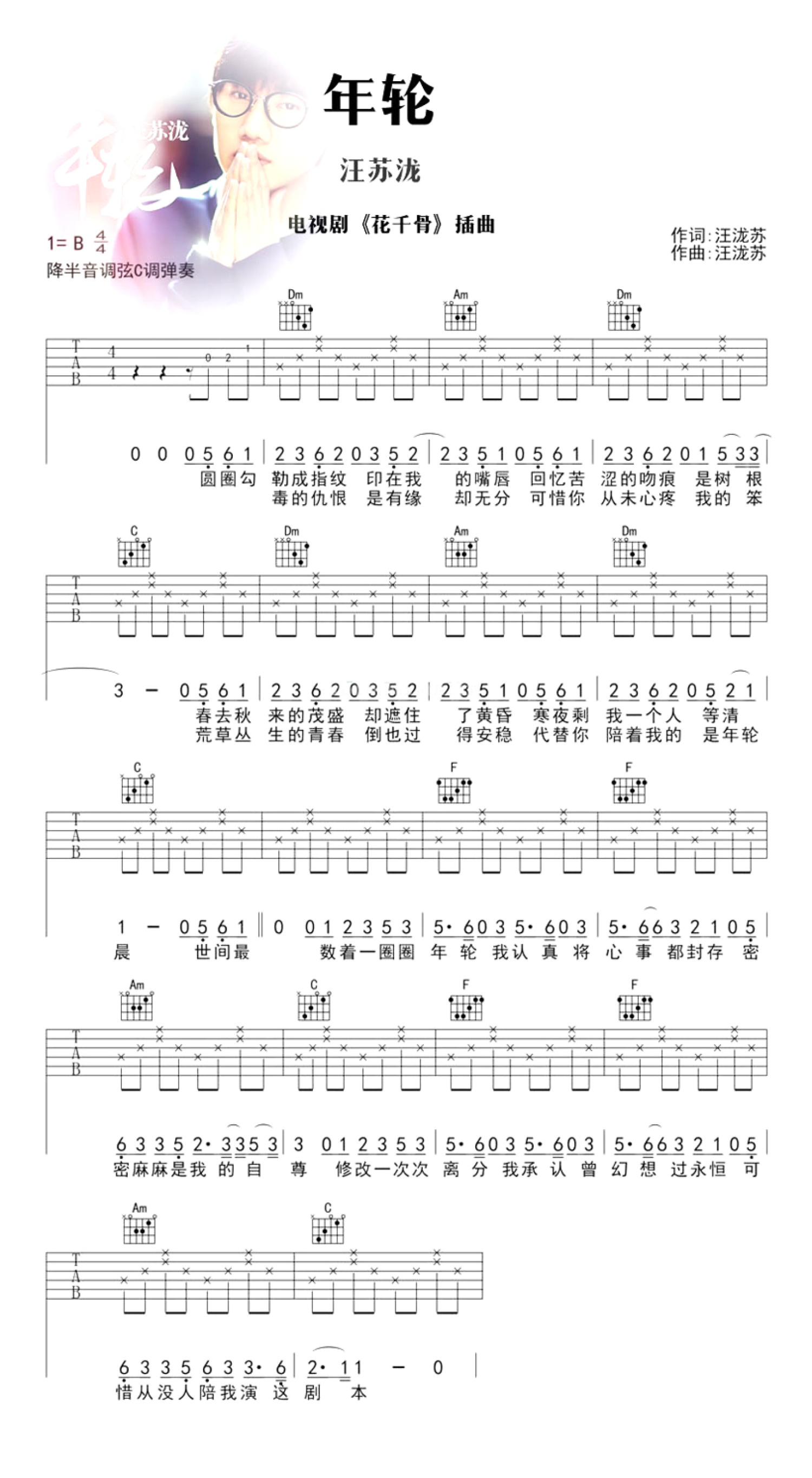 曲谱介绍: 汪苏泷年轮吉他谱,六线谱编配,原调B,降半音调弦,C调弹奏。年轮吉他弹唱谱,张碧晨演唱传奇仙侠电视剧《花千骨》插曲。前世今生,来世来生。牵绊彼此生生世世。或许注定剩下怀念与幻影。浮云如情,你如浮云。淡然离开,不留半点怜爱。若结局已定,离别已定。为何相遇、相识、相知?往事如烟,宛如初见。尘世种种,只为曾经绚烂。