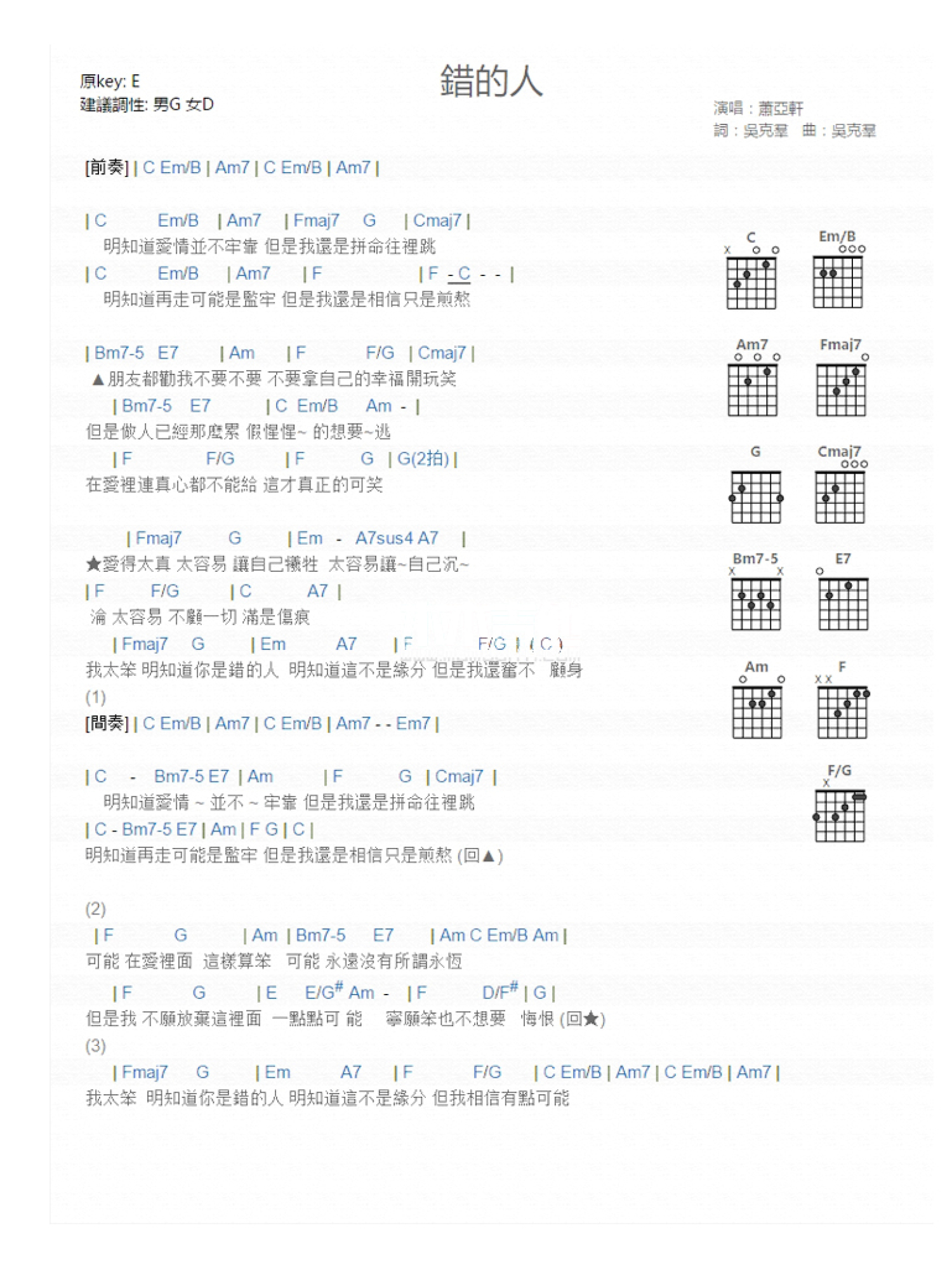 曲谱介绍: 错的人吉他谱txt_萧亚轩_文本谱_和弦谱