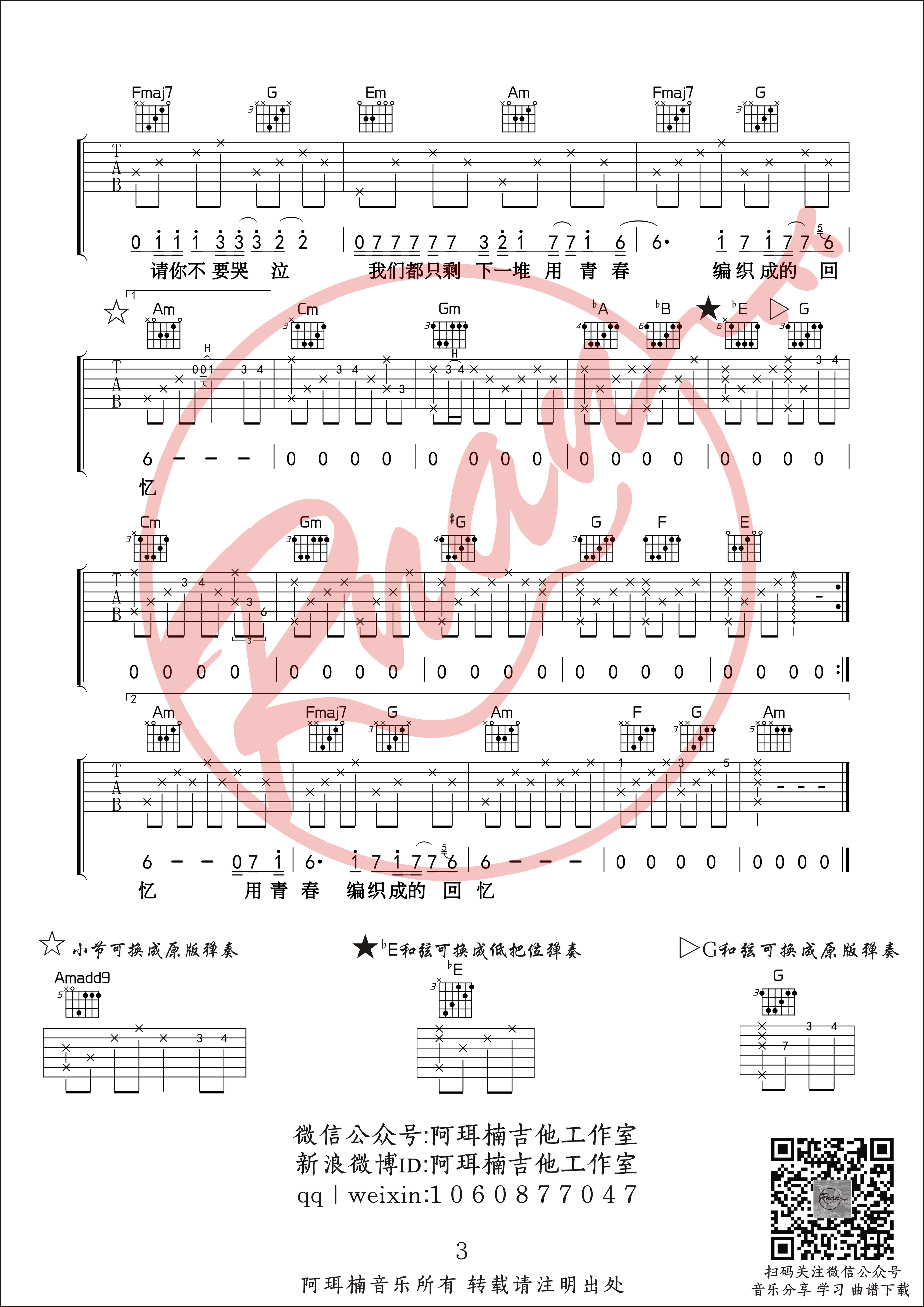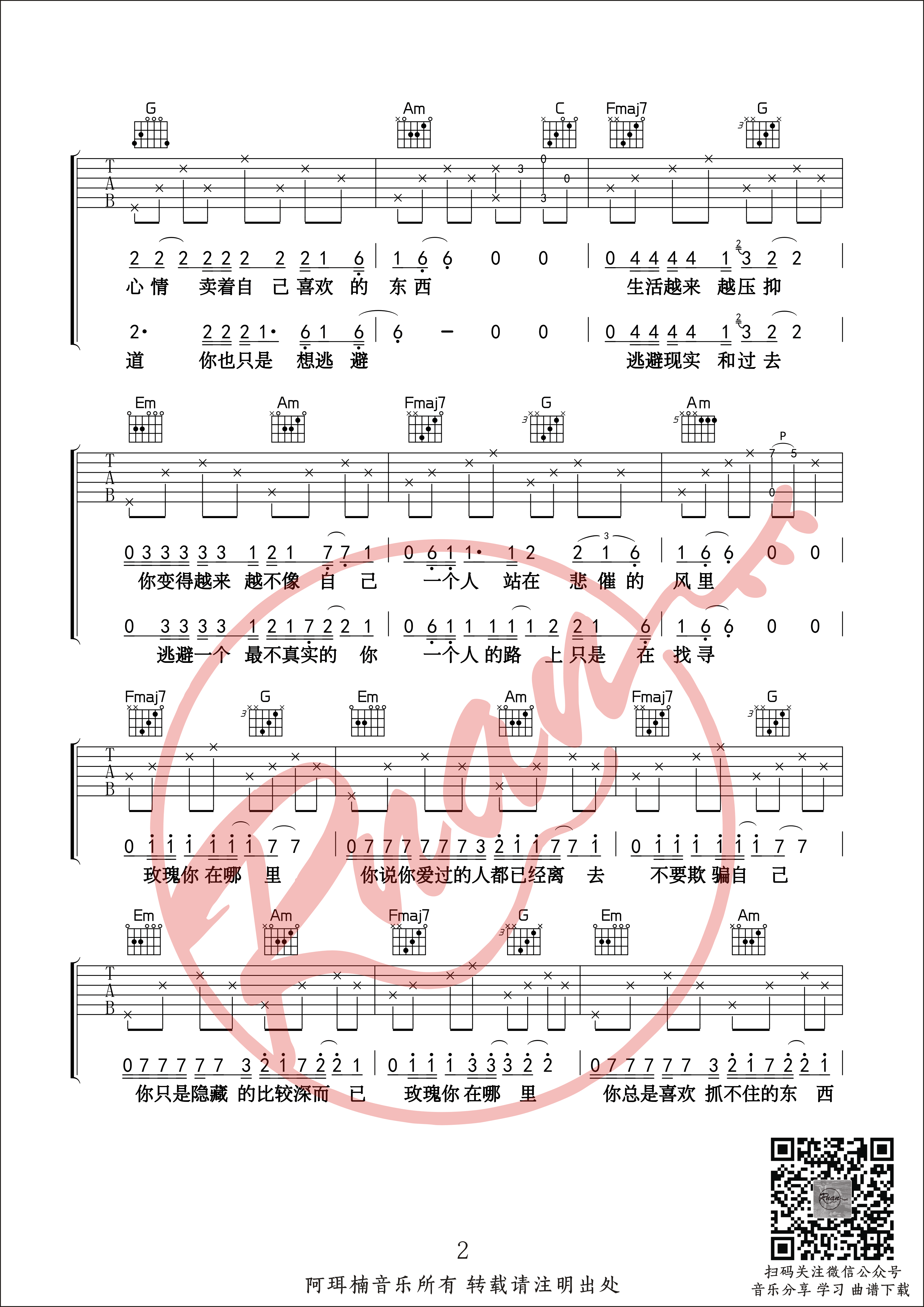 曲谱介绍: 《玫瑰》原版高质量吉他谱,阿珥楠吉他工作室编配的弹唱初级篇,贰佰的一首原创民谣歌曲,间奏稍稍难了一些,间奏部分运用了转调。《玫瑰》整体和弦不难,间奏稍稍有些难度。建议有一定基础的吉他琴友可以弹唱中尝试加入原版间奏,如果觉得有难度就可以把间奏换成前奏,这样也可以完整的演奏。 初次听贰佰的《玫瑰》,瞬间被开头的旋律打动,间奏也是巨好听,进而被贰佰沙哑的嗓音吸引,无论是歌曲还是嗓音,都有几分李志的影子。如果琴友对阿珥楠音乐编配的《玫瑰》吉他谱在弹奏上或者对六线谱有疑问,欢迎大家加我qq/微信:1060877047,随时咨询随时解答!