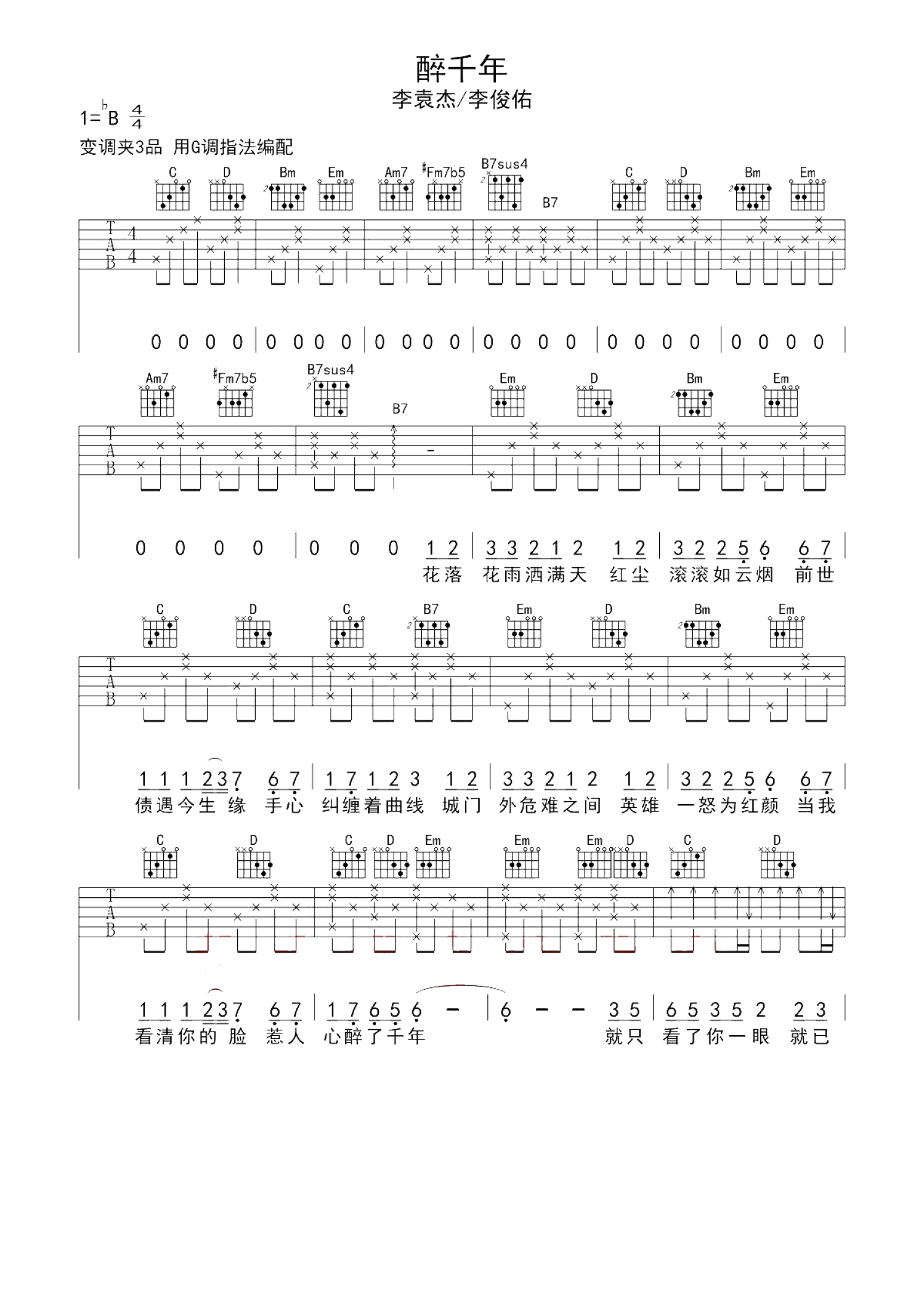 曲谱介绍: 醉千年吉他弹唱谱-李袁杰/李俊佑